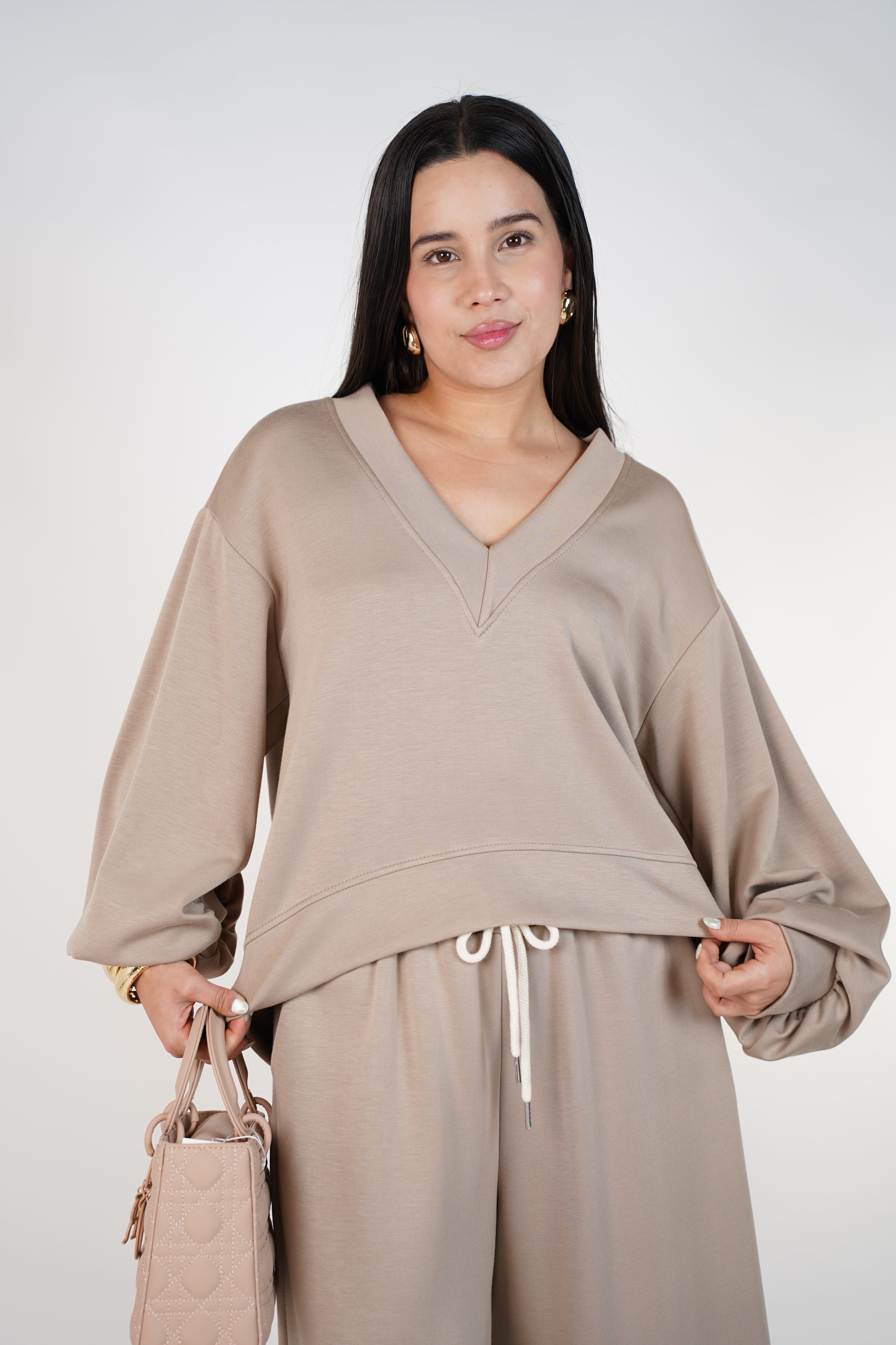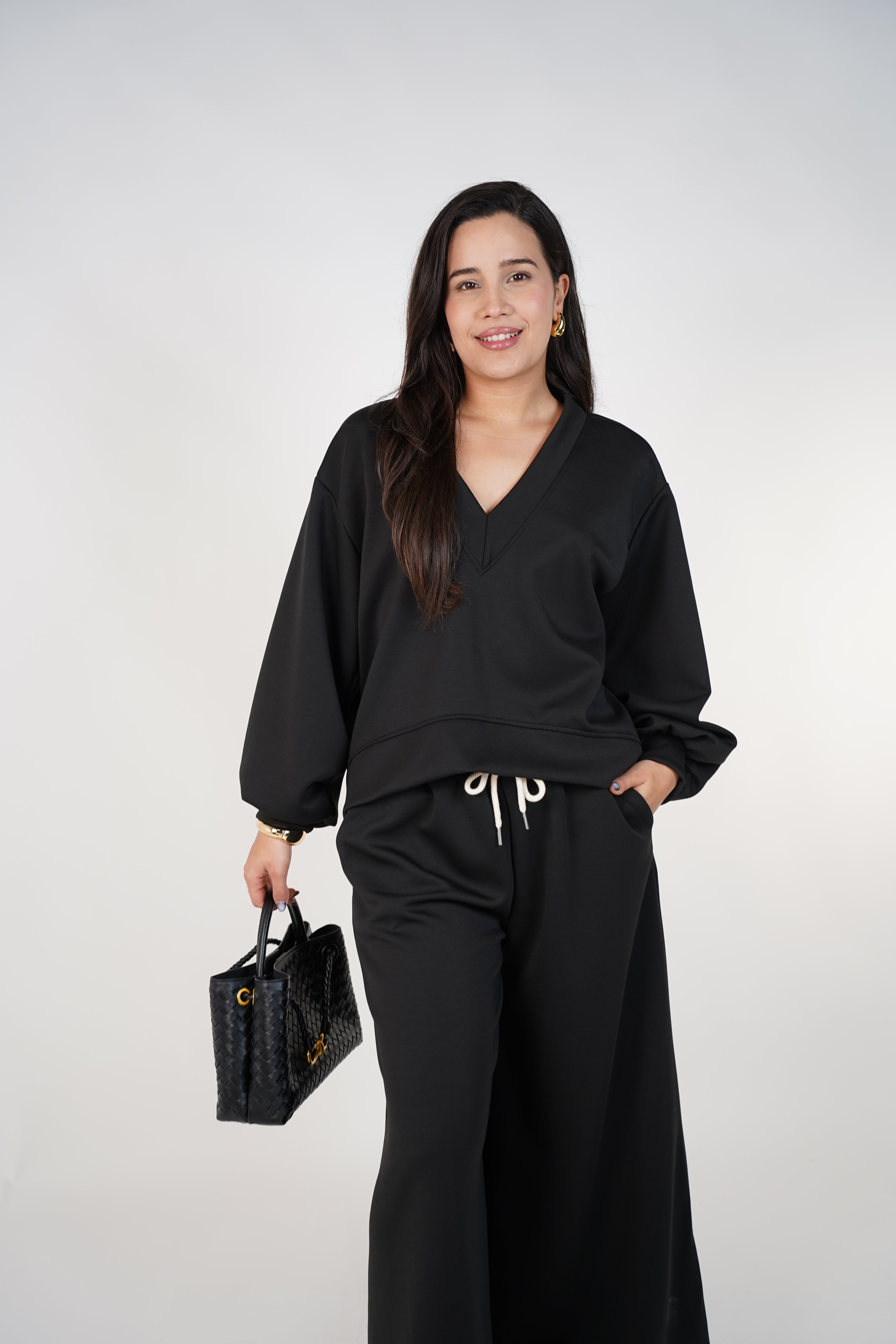 A chic, cozy, and elevated lounge set featuring a relaxed V-neck top and wide-leg pants—perfect for everyday comfort with a touch of effortless style.