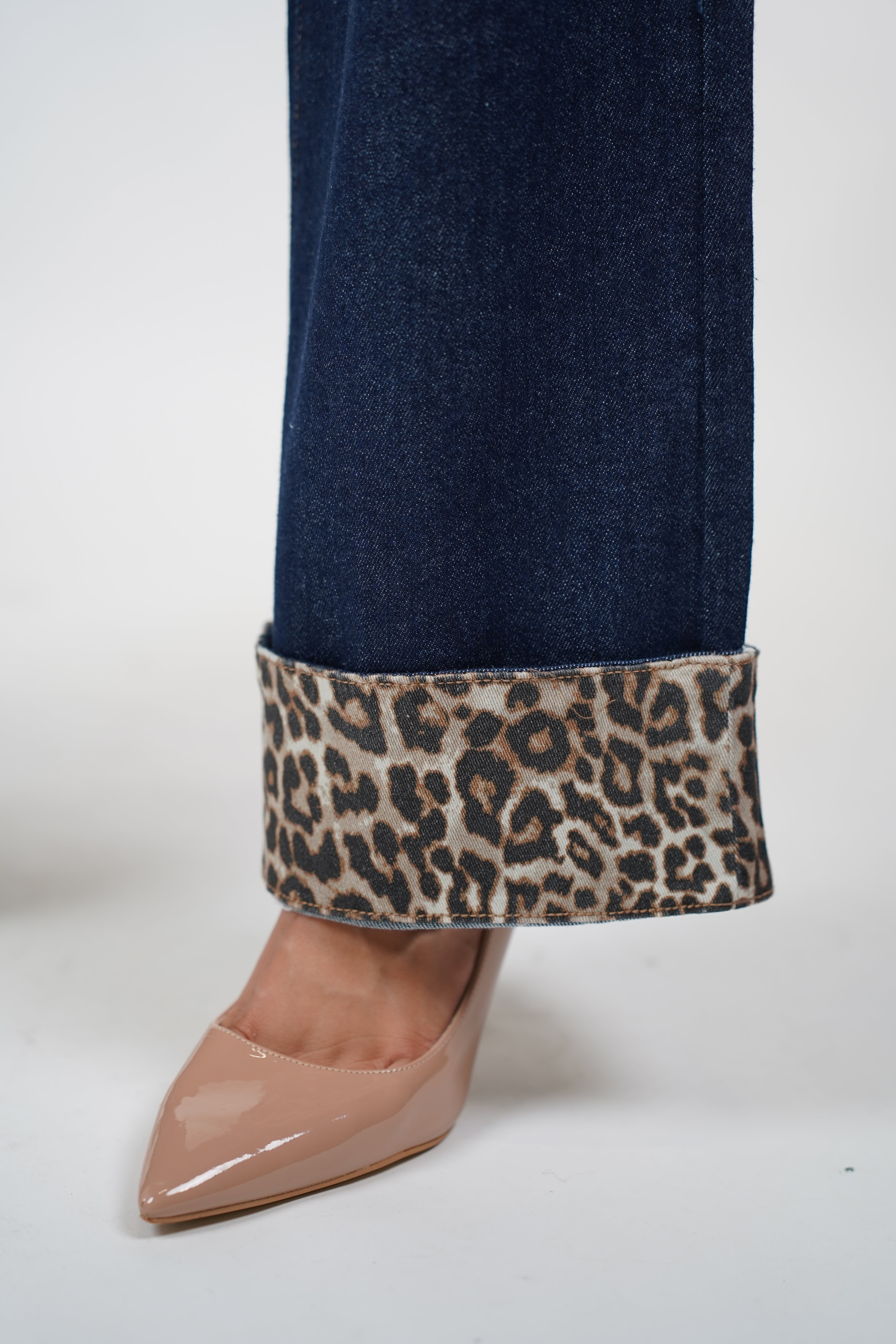 Nolyn Wide Leg Jeans with Leopard Cuff – Dark Wash Statement Denim | Carema Boutique