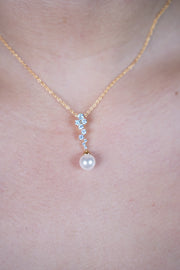 The Chime Pearl Necklace captures refined beauty in its simplest form. Featuring a slim gold chain, cascading cubic zirconia stones, and a luminous pearl drop, this piece is made to elevate any neckline. Whether worn on its own or layered with your favorite chains, it adds an effortless elegance to casual looks and formalwear alike.