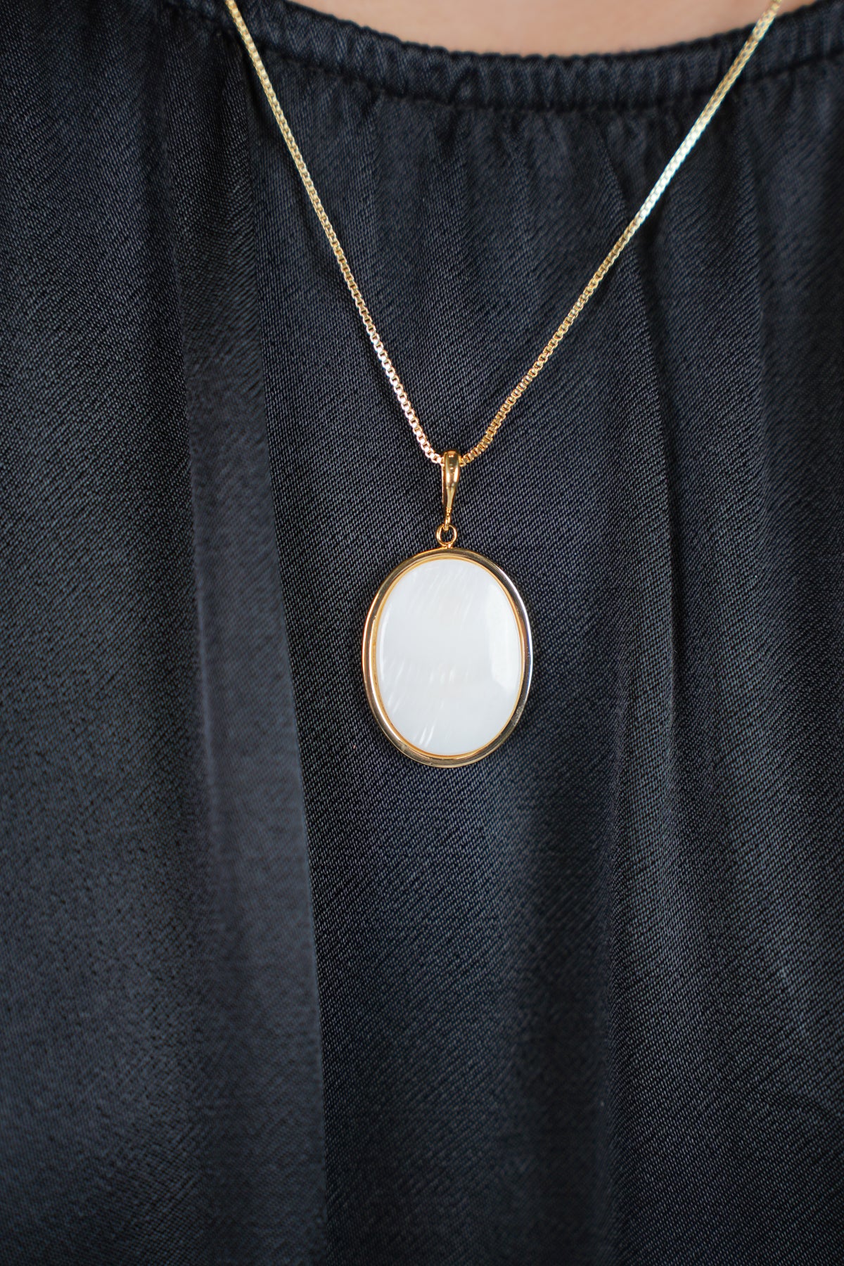 Gold necklace with pearlescent oval pendant worn over a black top.