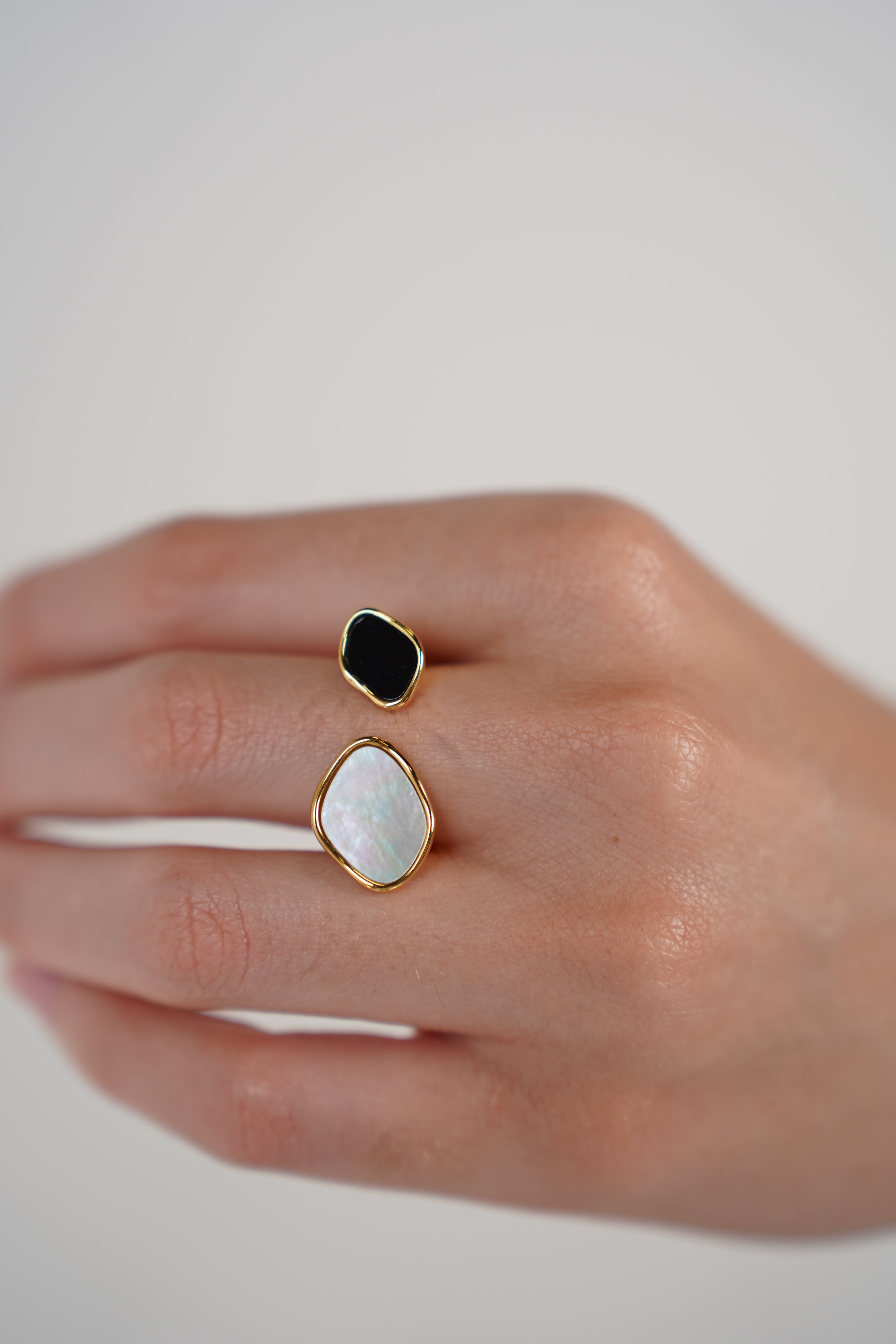 Close-up of gold open ring with one luminous crystal stone and one black stone on model’s hand.