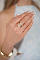 Gold open ring with two pearls styled on hand with neutral nails.