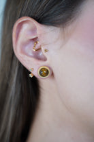 Close-up of gold stud earring with green stone worn on ear.