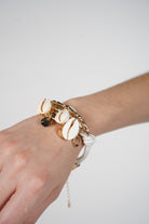 Close-up of the Evale Rope/Shells Bracelet featuring white rope band, natural cowrie shells, and gold-tone charms worn on the wrist.