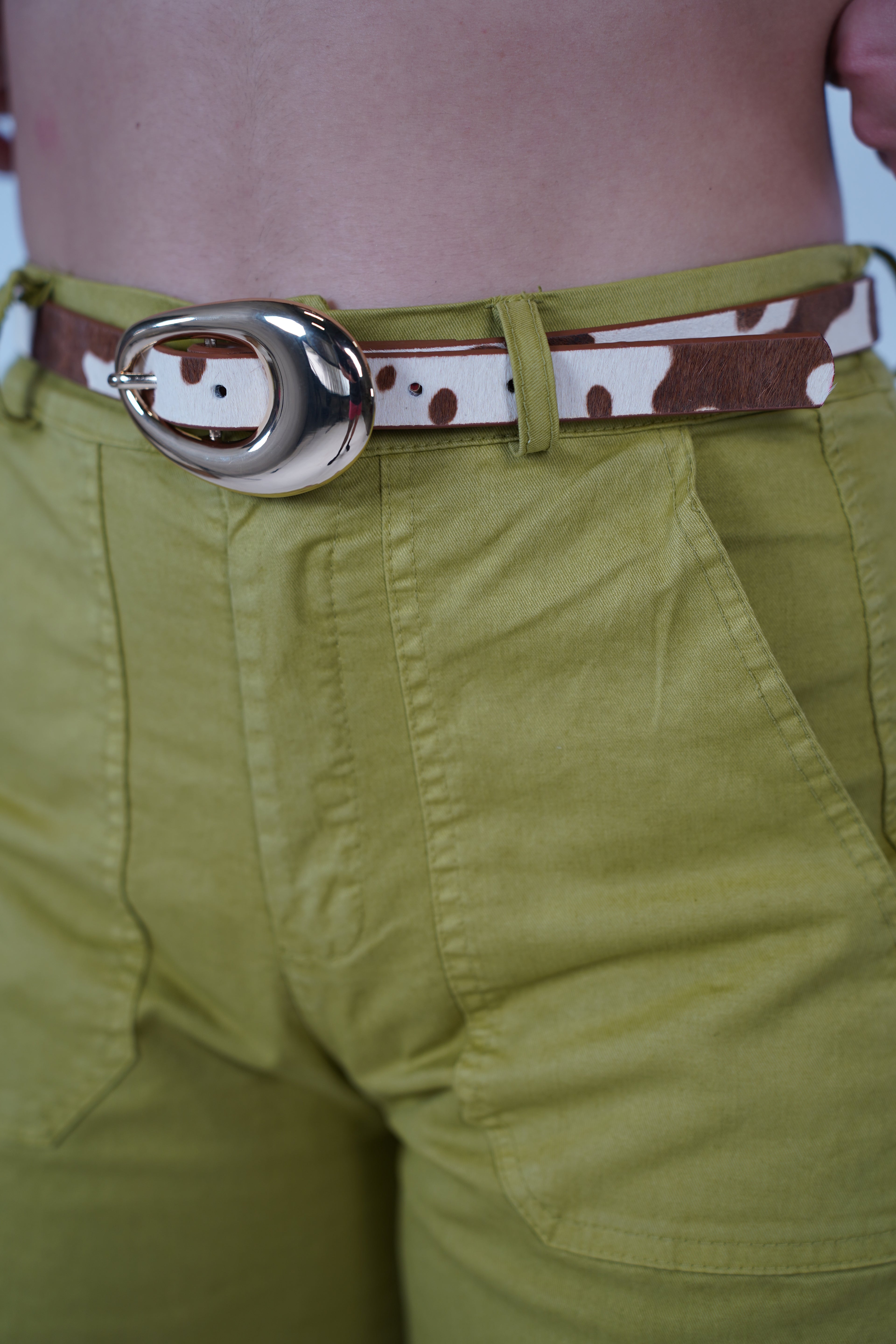 Close-up of a cow print belt with gold buckle styled on green shorts and black top.