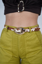 Model wears the belt with high-waisted green shorts
