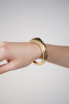 Gold chunky bracelet with curved, sculptural design worn on wrist.