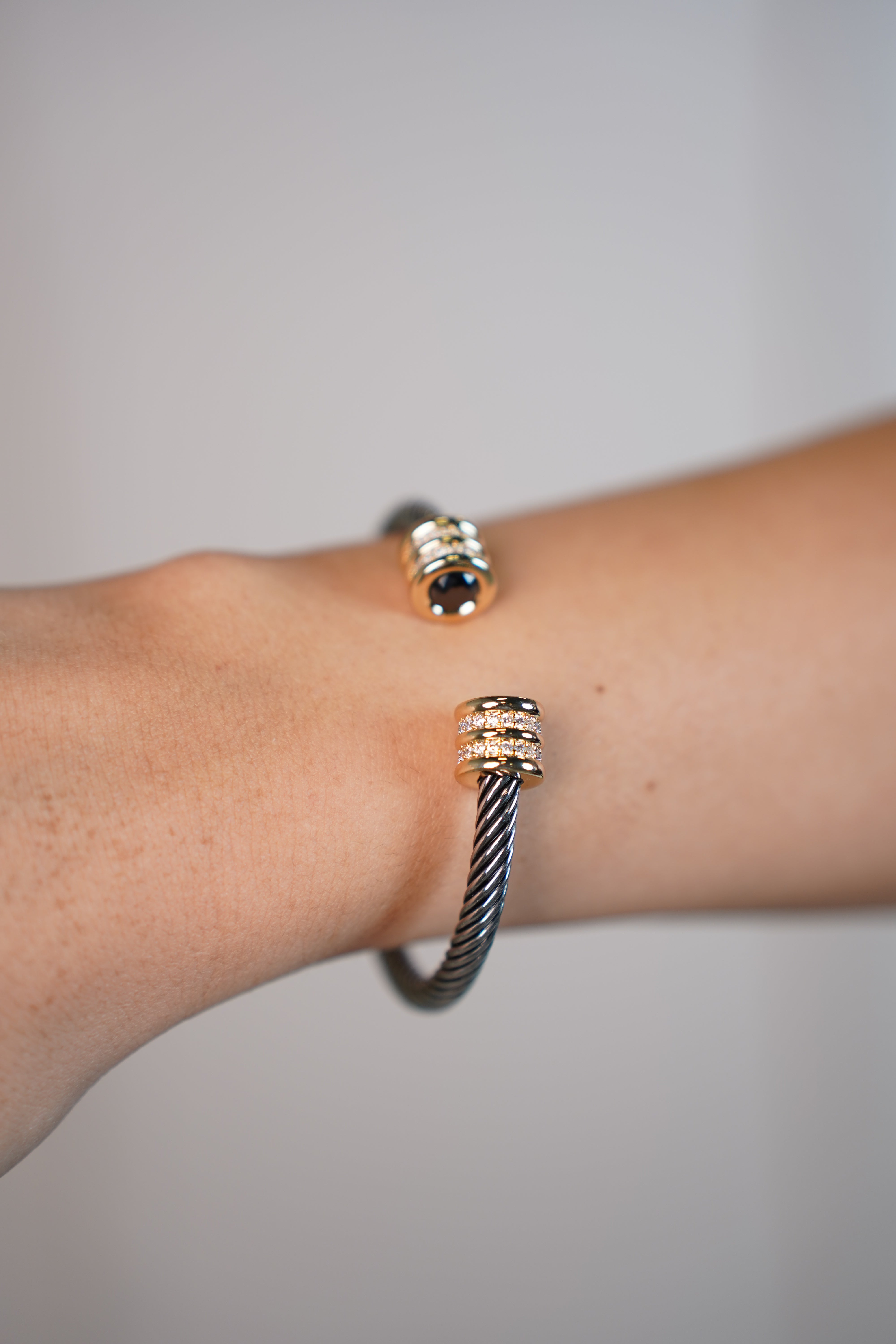 Sleek, structured, and effortlessly edgy—the Rune Bracelet is your new go-to for elevating everyday looks. This open cuff design features twisted steel cables for a modern industrial vibe, finished with gold-toned barrel ends encrusted with dazzling crystals and a deep black gem detail. Whether worn solo or layered, it adds instant polish and personality to your wrist stack.