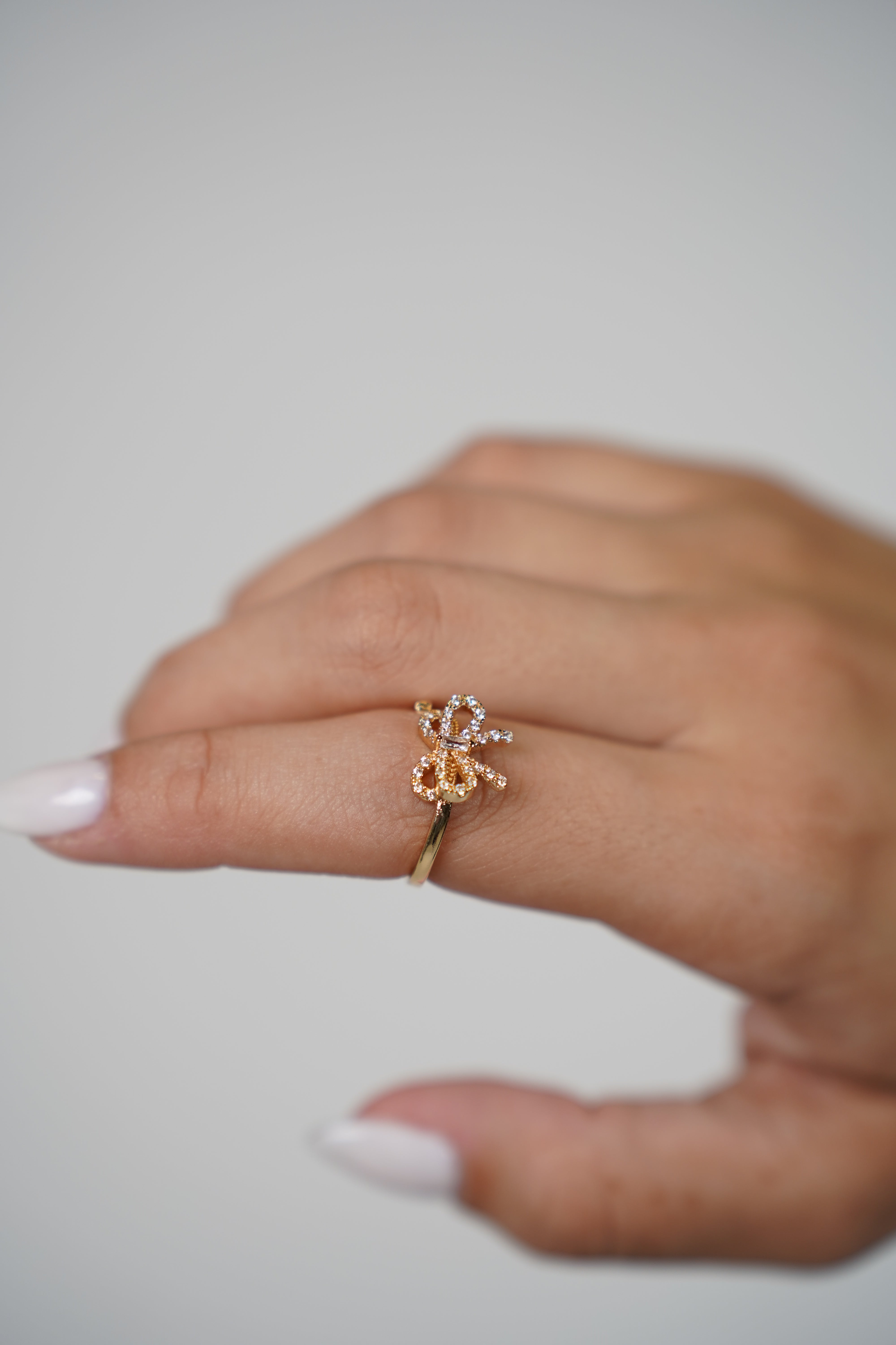 Alt text: Hand wearing a gold ring with mini crystal bow design.