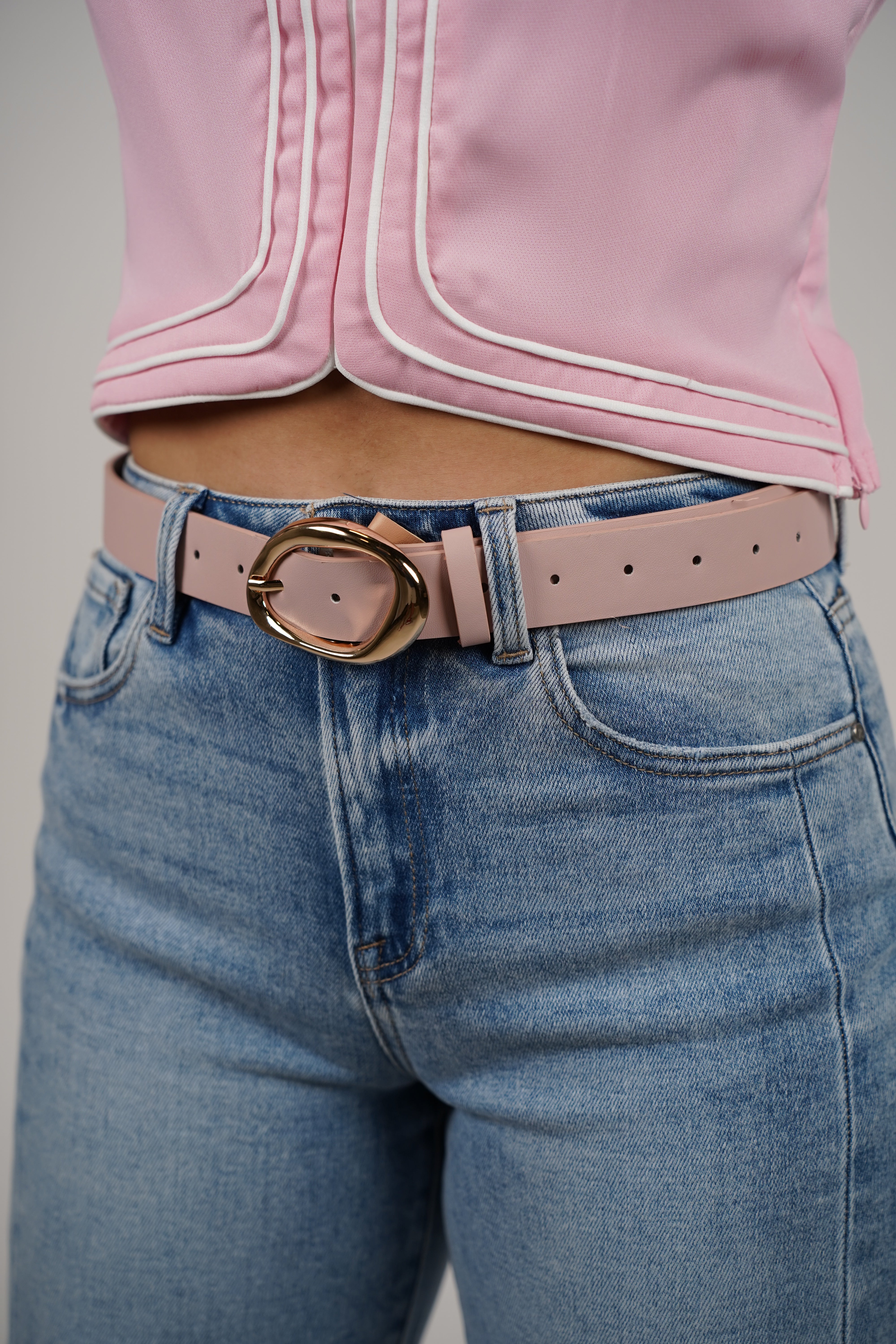 Close-up of a blush pink belt with a rounded gold buckle, styled on light-wash denim and paired with a pink top