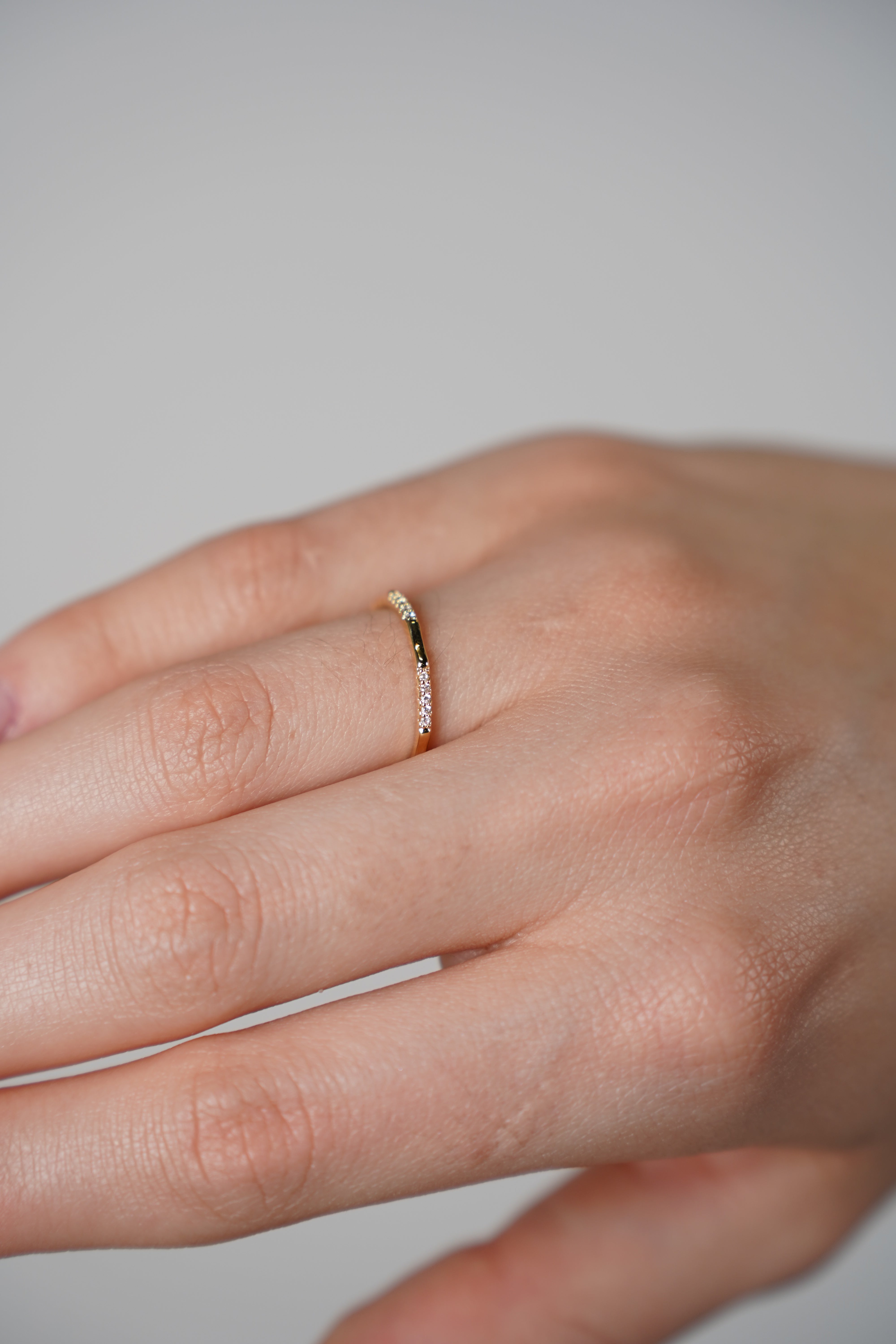 Meta Description: The Yezzi Thin Ring is a minimalist gold-tone band with crystal accents. A delicate and versatile piece perfect for stacking or wearing solo.