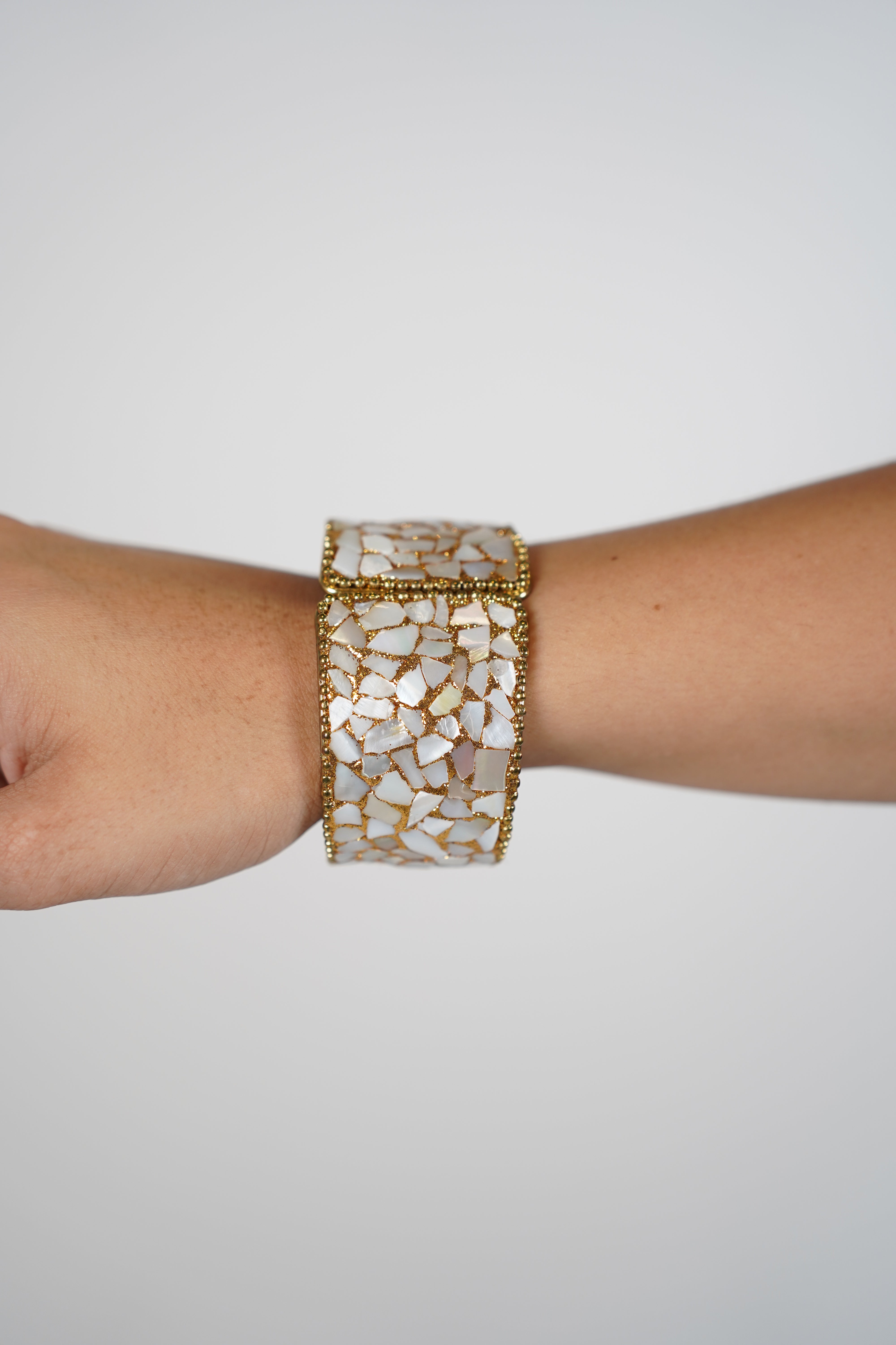 The Zani Chunky Bracelet is the definition of wearable art. Designed with a luxurious mosaic pattern made from pearl-like shards bordered by delicate gold trim, this bold cuff makes a radiant statement with every movement. Whether styled solo or stacked, it elevates even the simplest outfit with effortless charm. Perfect for special occasions or everyday glam, Zani is a must-have accessory for those who love timeless sparkle with a modern edge.
