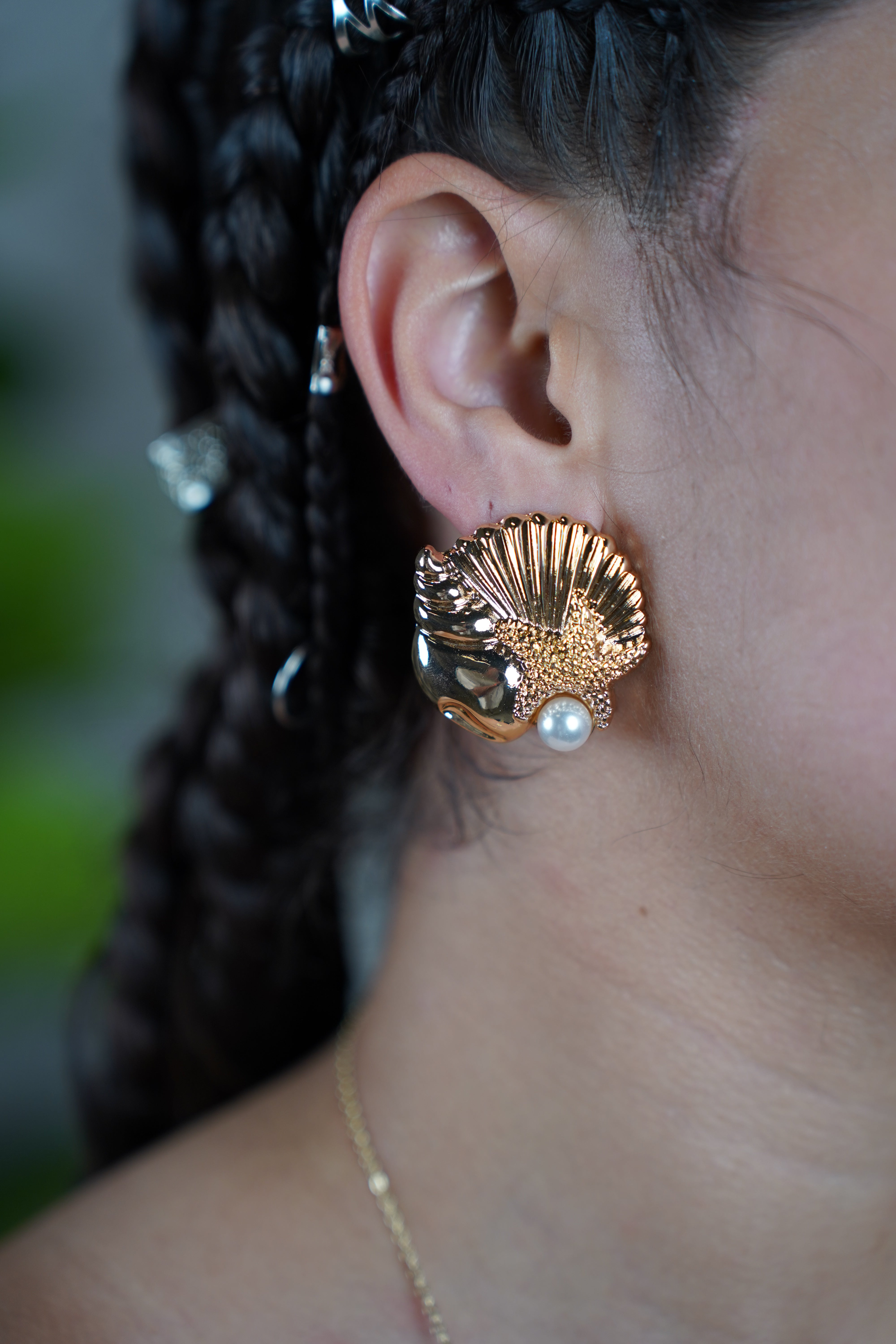 Close-up of gold ocean-themed earrings shaped like a seashell and starfish with a pearl detail.