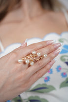 Gold spiral ring with clustered faux pearls styled on a hand with French manicure.