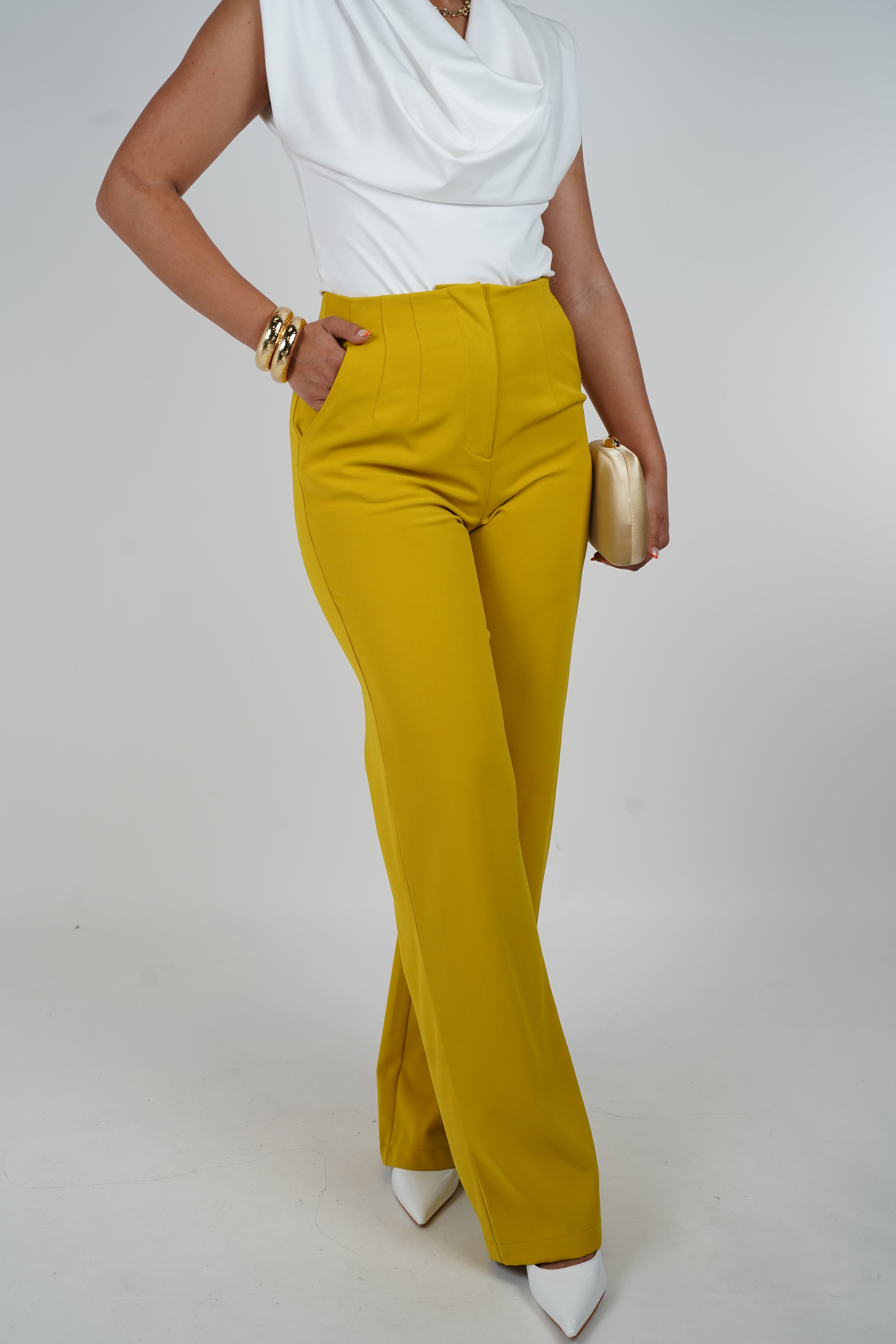 High-rise wide-leg pants in a vibrant mustard yellow tone with a tailored finish.