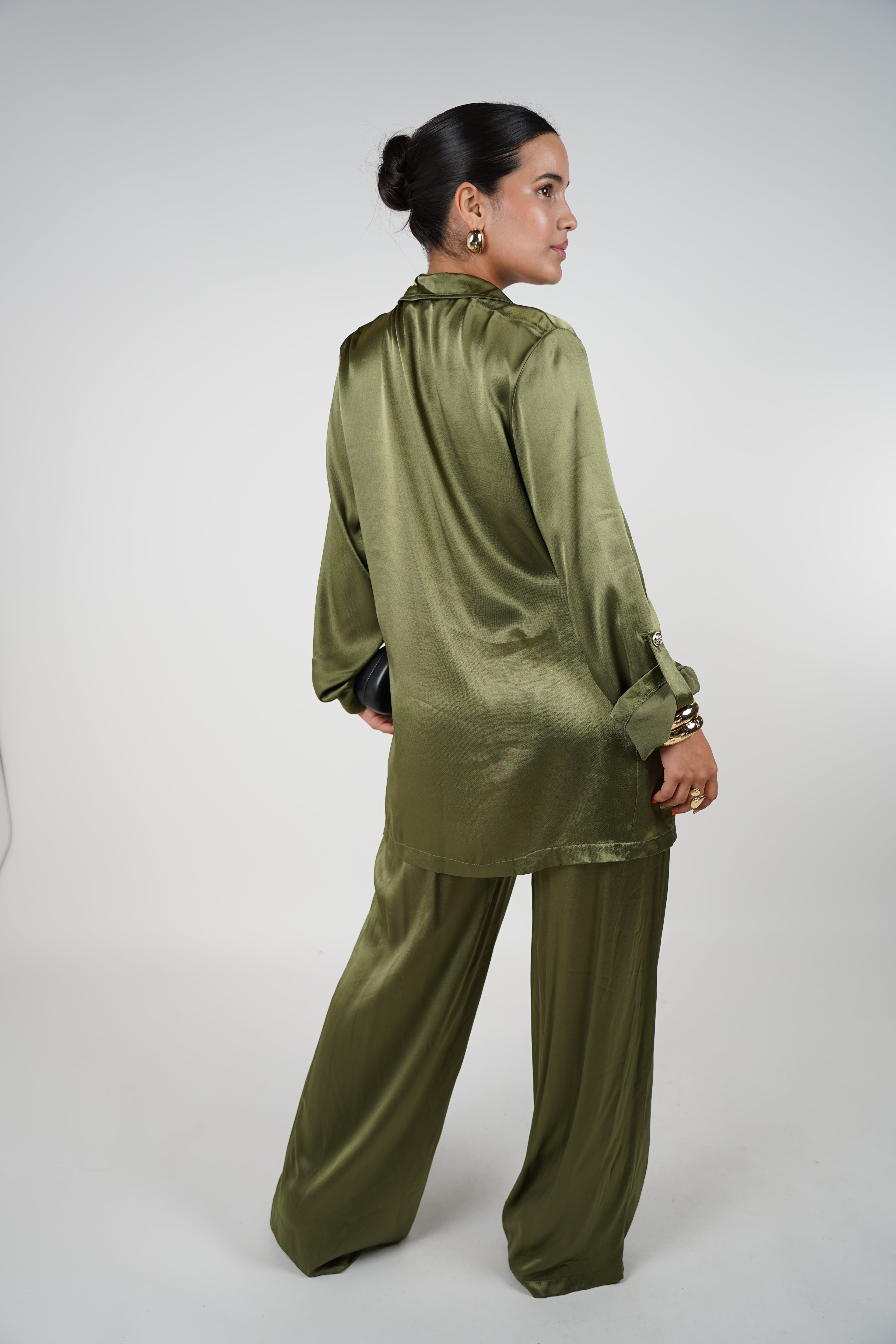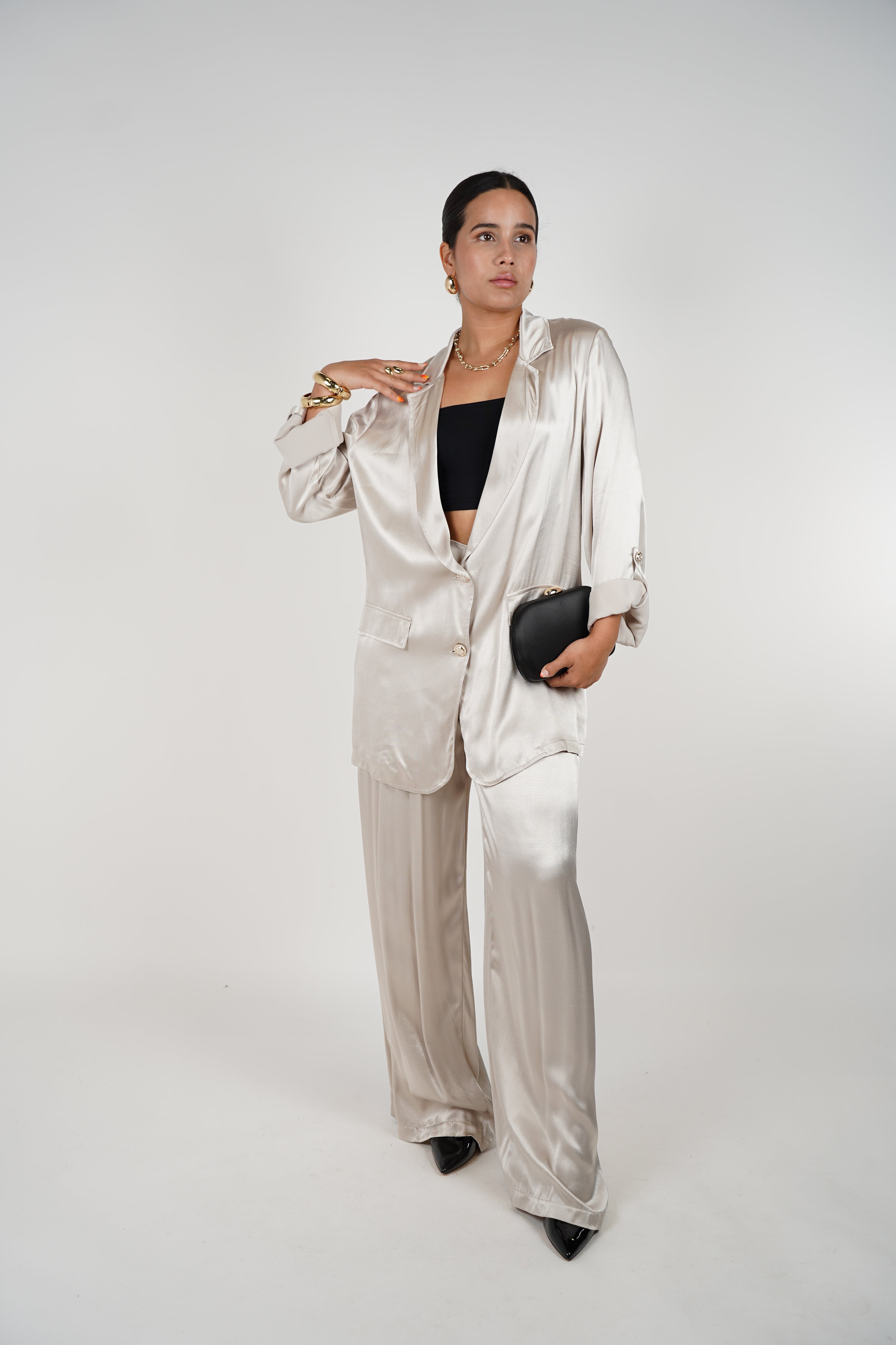 A lightweight satin set with an oversized blazer and relaxed wide-leg pants for an effortlessly polished look.