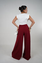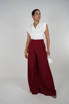 Model wearing high-waisted wide-leg maroon pants with white draped sleeveless top, holding a small white handbag