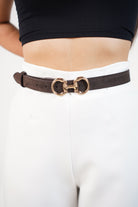 Model is styled with the Aurevia Suede Ferma Belt worn at the waist to highlight its structured silhouette and statement gold buckle.