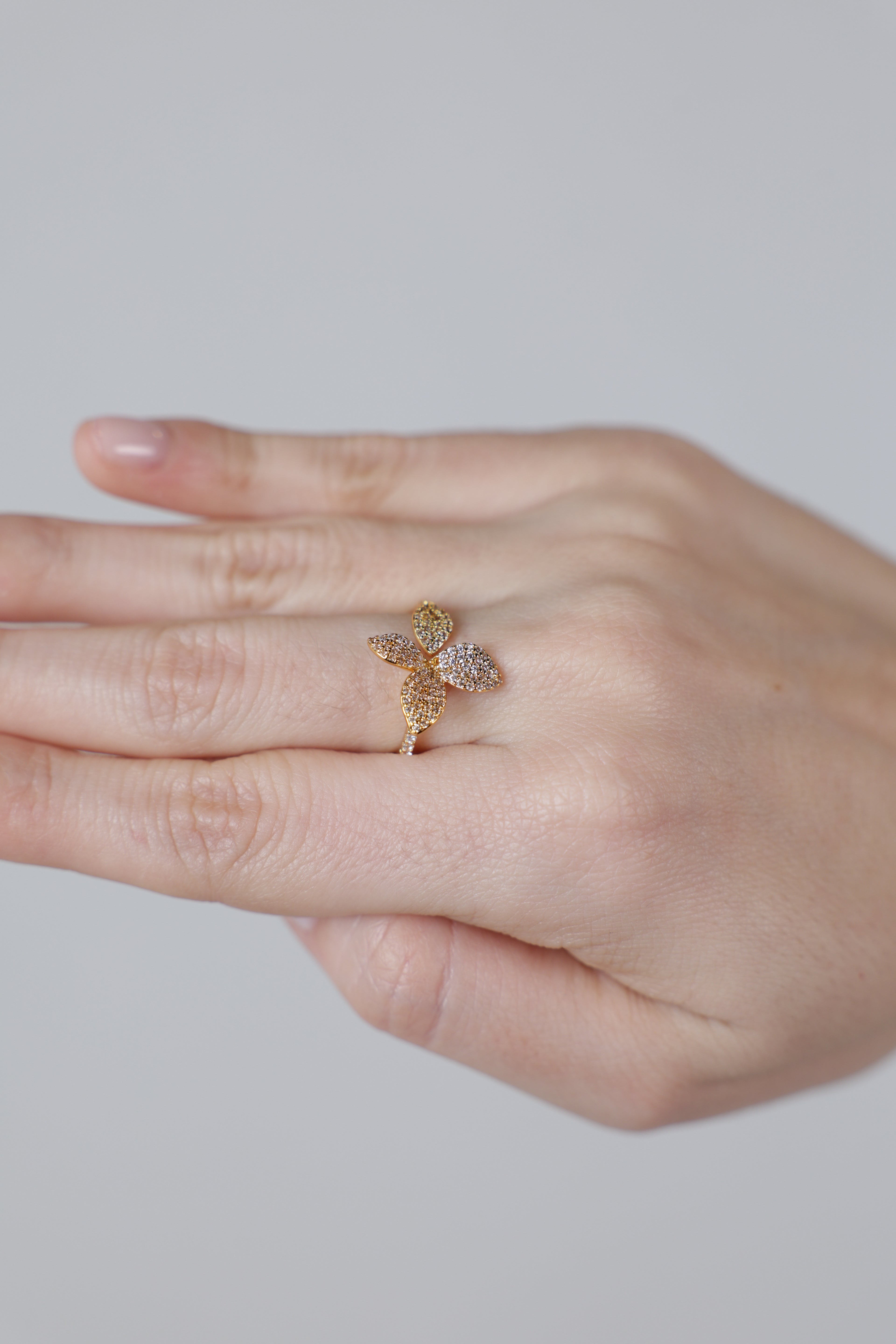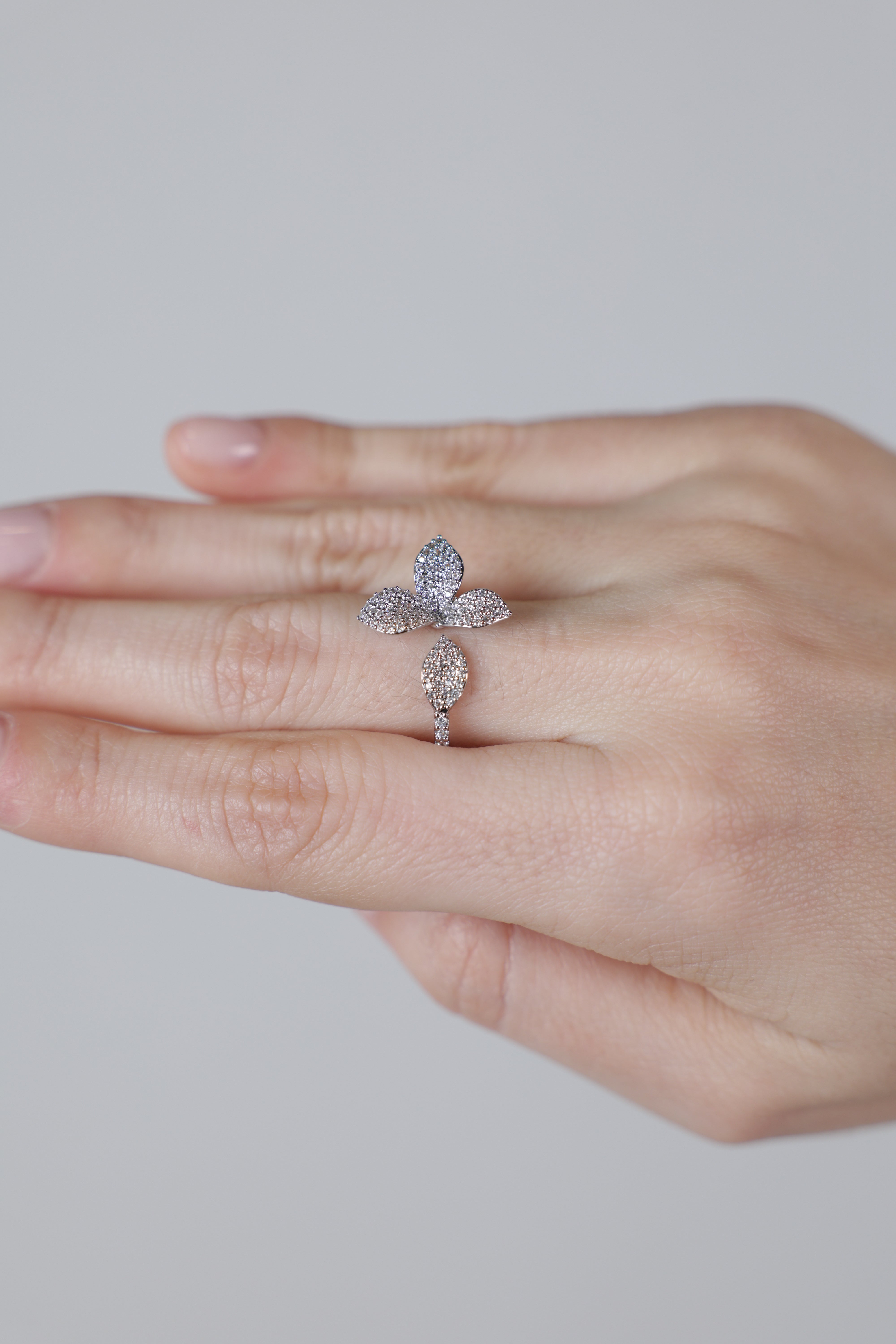 A sculptural pavé leaf ring available in gold and silver—perfect for elevating everyday elegance or completing an evening look.