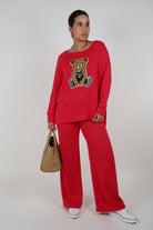 This cozy red knit set features a playful embroidered teddy bear on a relaxed sweater and matching wide-leg pants for everyday comfort.