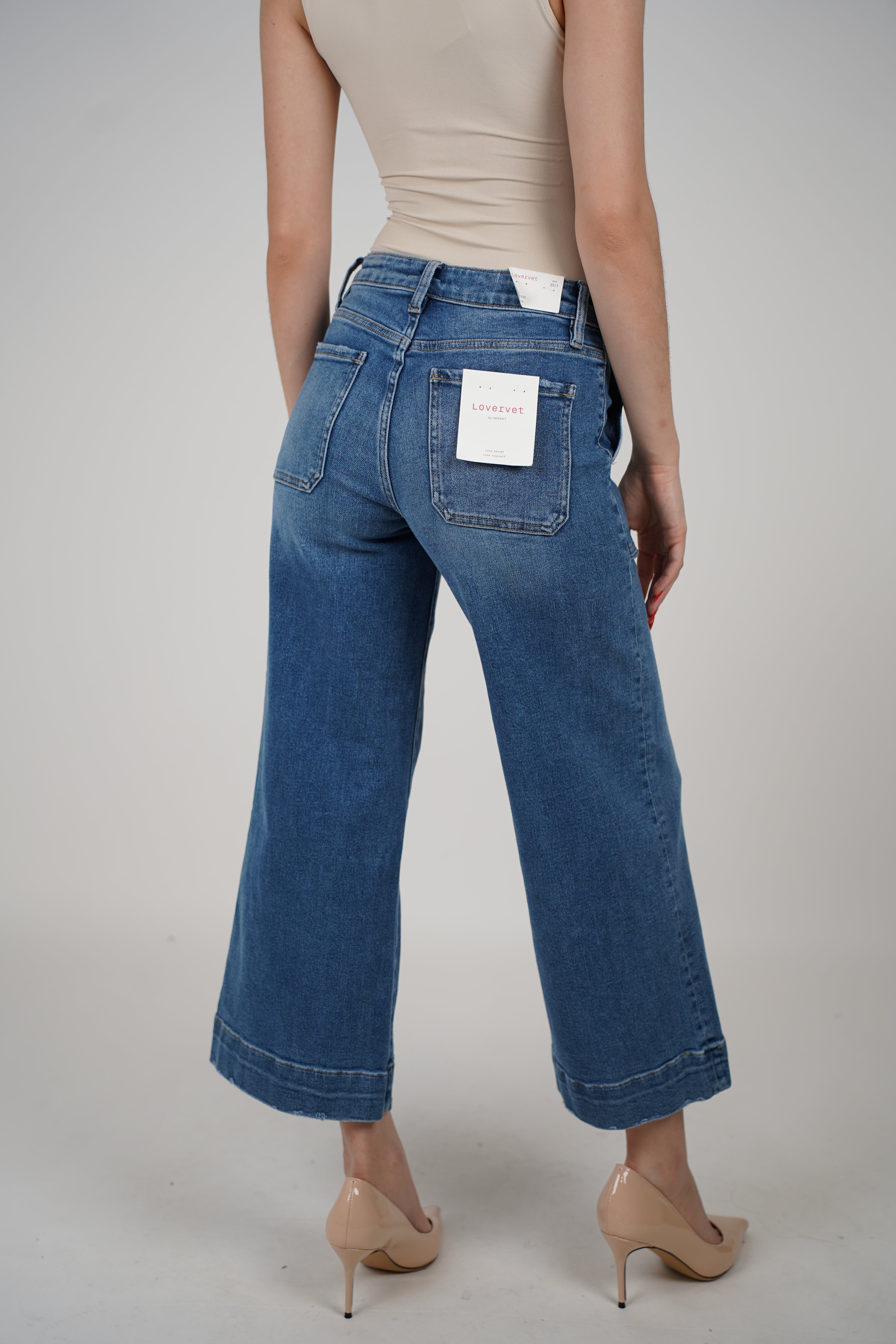 Model wearing medium-wash cropped wide-leg jeans with front seam detail and nude top.