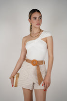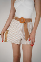 Close-up of high-waisted beige and white striped shorts with front pockets and woven circular belt