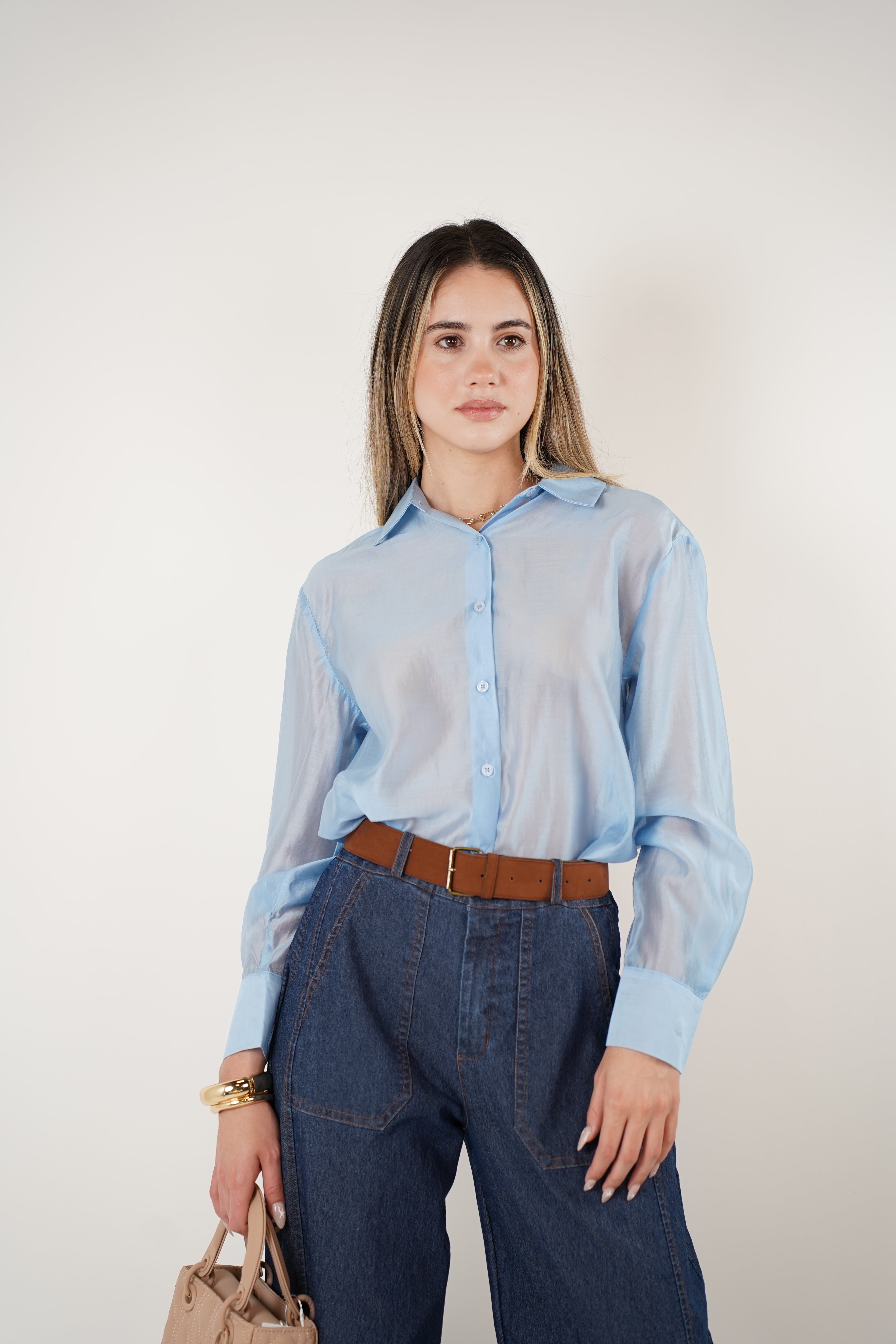 Model is 5'7", wearing the Davi Oversized Button Down with white wide-leg trousers and minimal gold jewelry. Fabric is sheer; styling with a neutral or matching undergarment recommended.