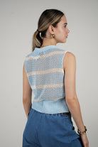 Model wearing the Demi Striped Crochet Vest in beige with navy stripes, styled over a tank and light blue pants.