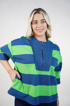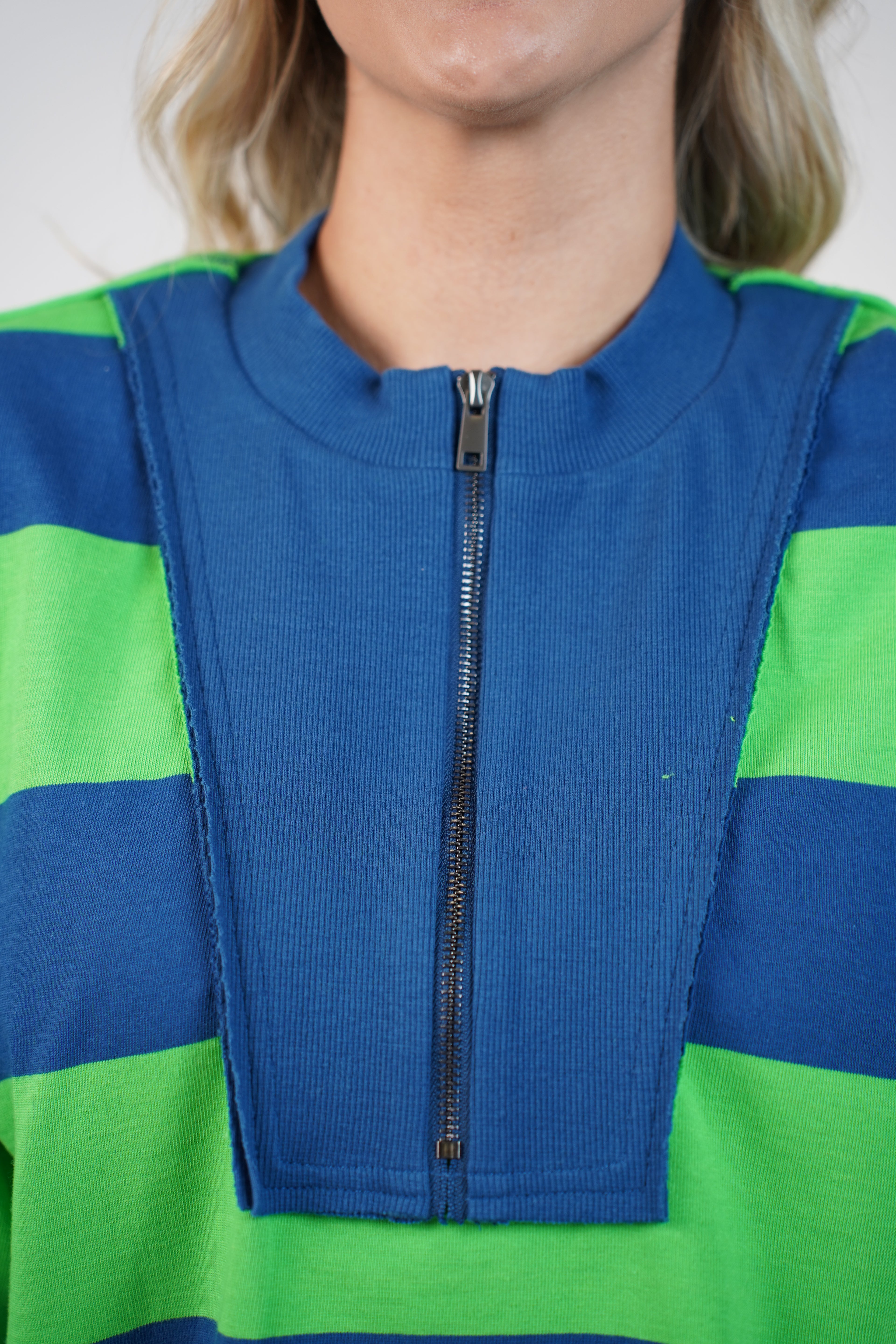 Woman wearing a blue and green striped half-zip sweater styled casually with denim