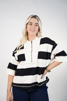 Shop the Elarosy Striiped Sweater featuring bold stripes, a half-zip neckline, and a relaxed fit. A perfect blend of comfort and style.