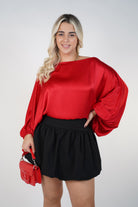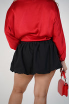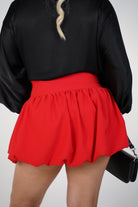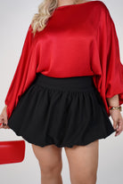 Woman wearing a red mini bubble skirt with a structured waistband styled with a black blouse and heels