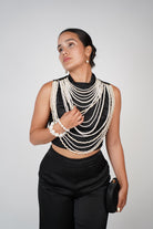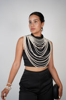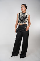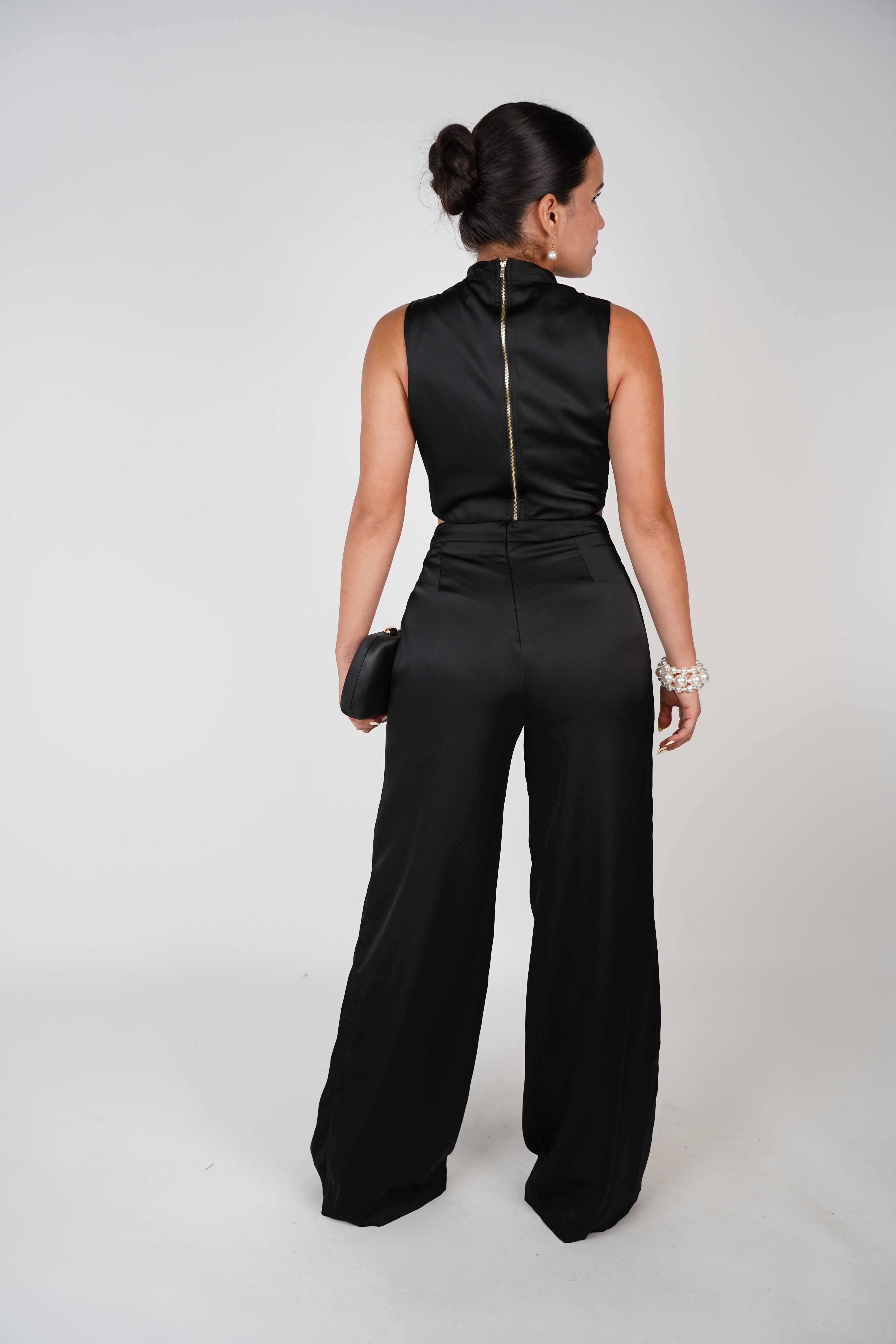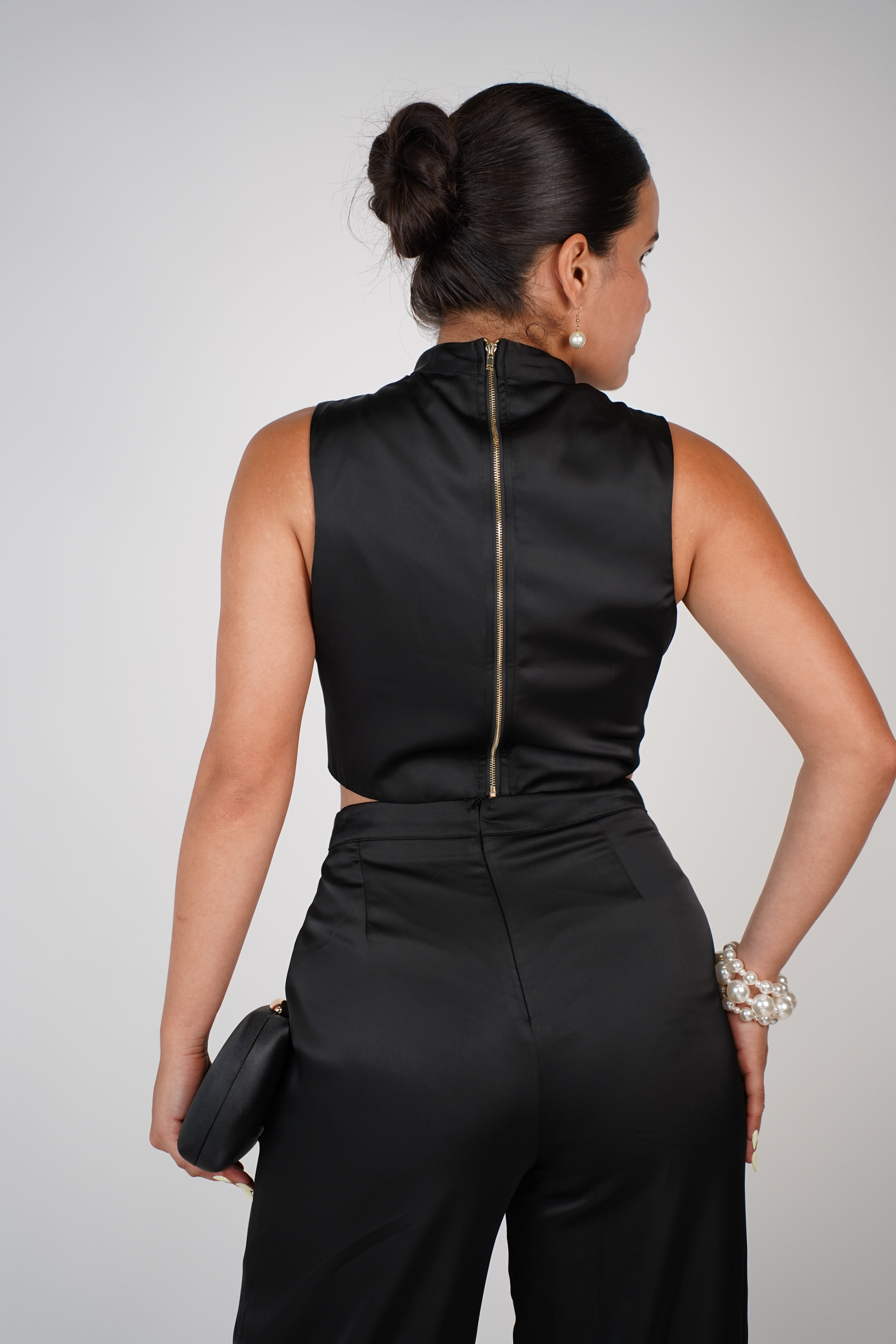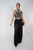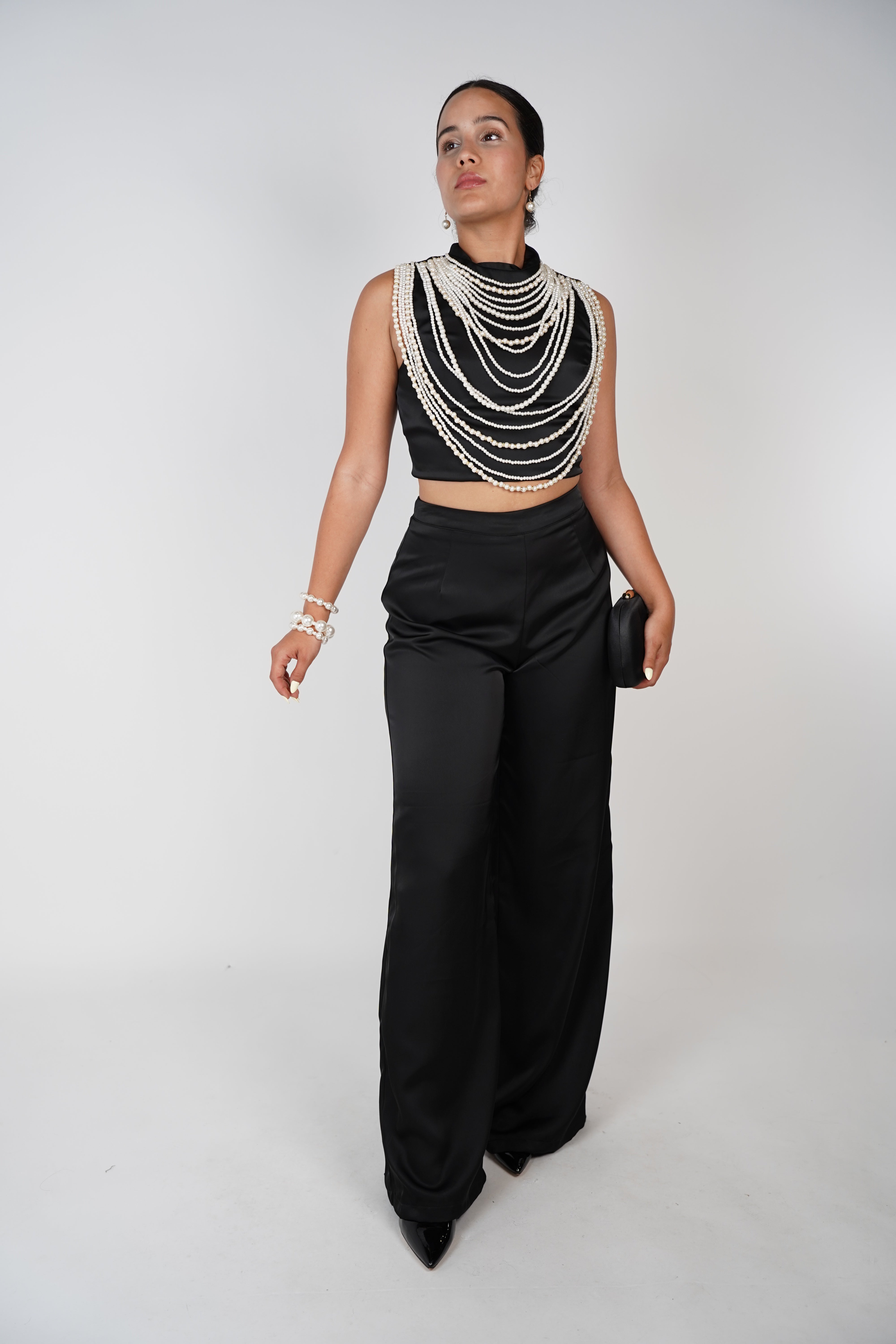Model wearing black satin Gracelyn Pants Set featuring high-neck crop top and wide-leg pants, styled with pearl accessories.