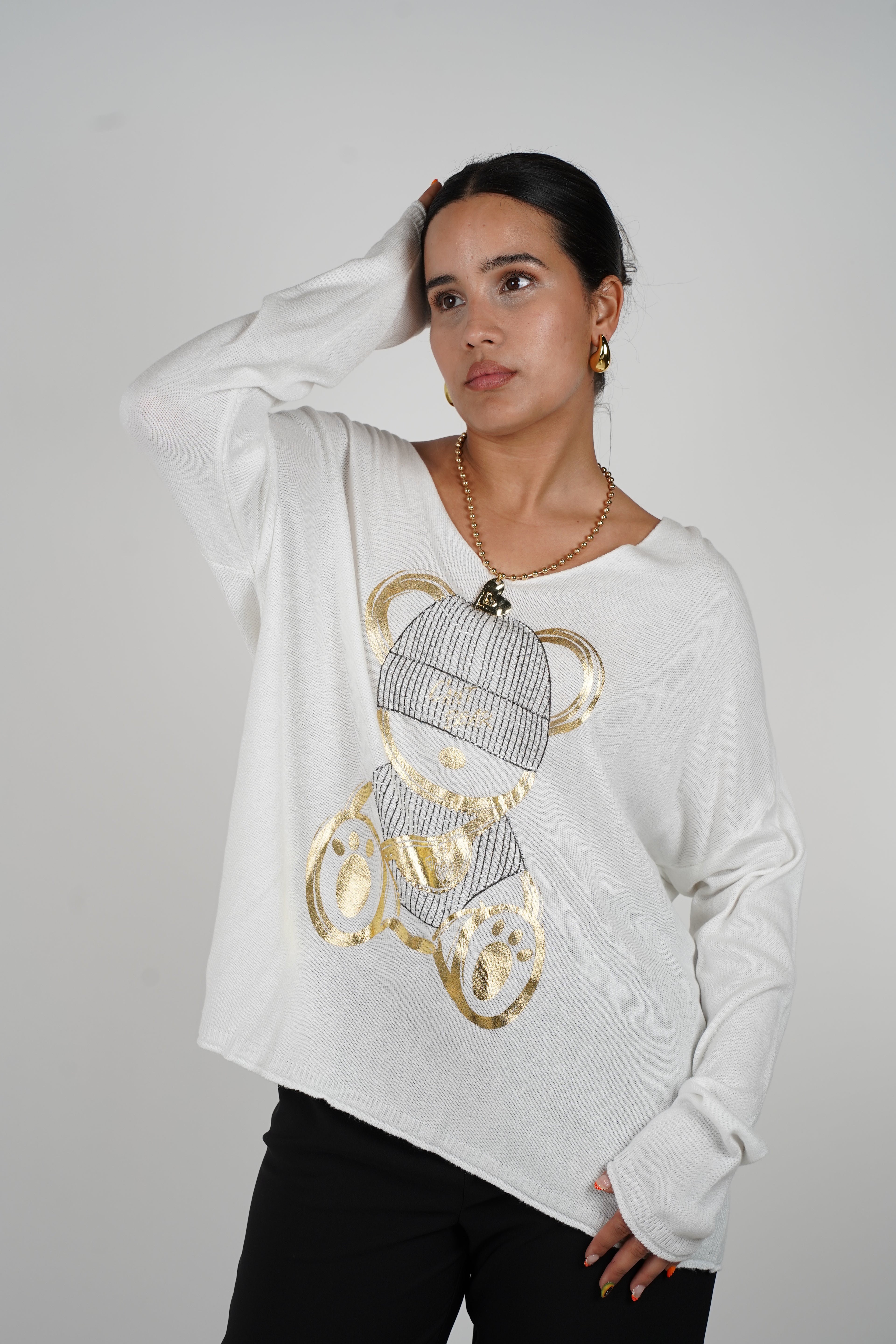 Meta Description: Add cozy charm to your wardrobe with the Gracie Bear Sweater, featuring a golden teddy graphic and relaxed fit. One size. Shop now at Carema Boutique.