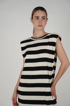 Italian Striped Maxi – Black & Cream Sleeveless Dress with Shoulder Detail