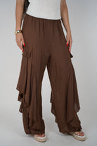Model wearing brown Kale Ruffle Linen Pants with wide legs, side ruffles, and cargo-style pockets.