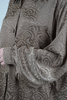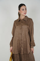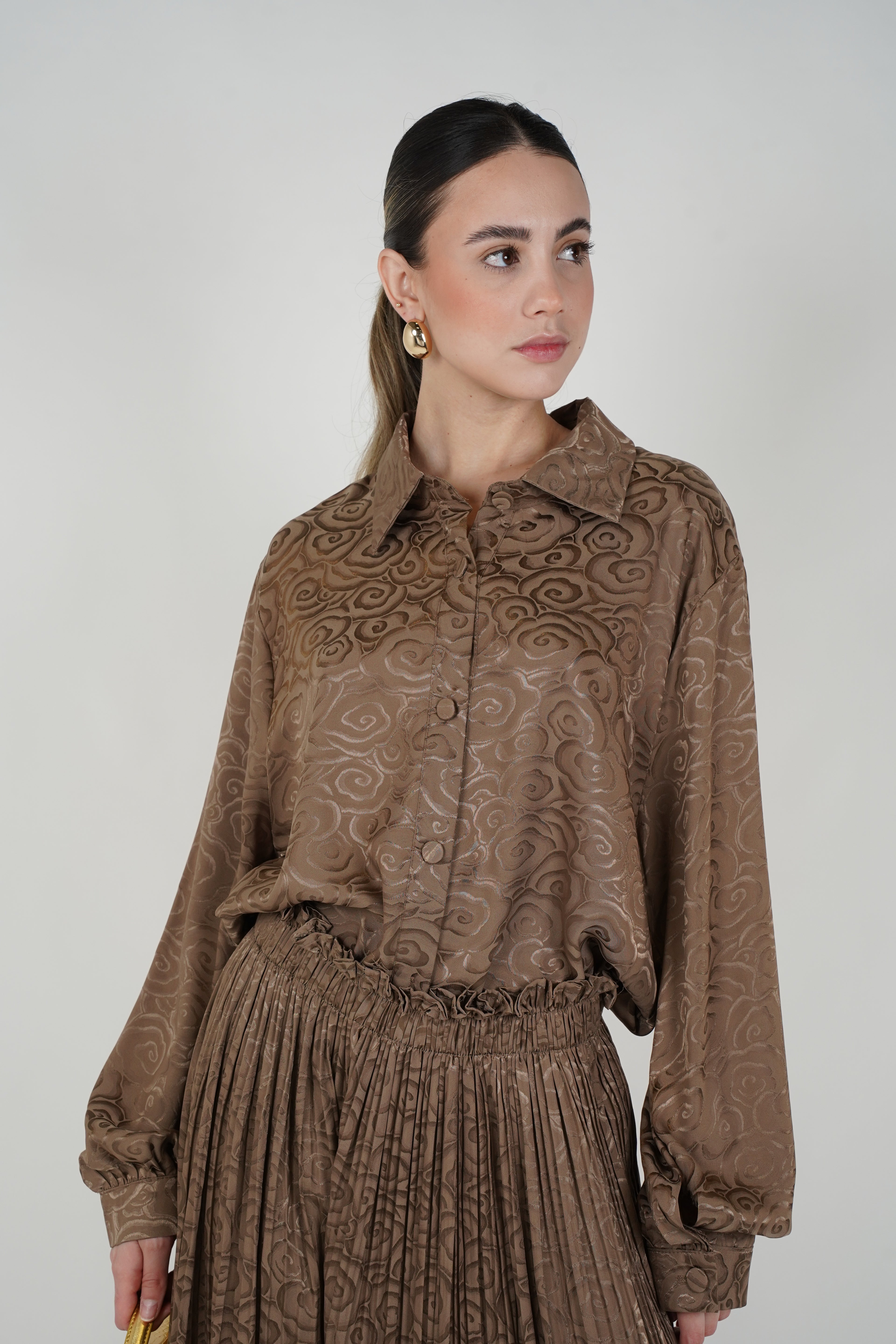 A coordinated pants set featuring a flowy button-down top and wide-leg pleated pants with an all-over textured pattern for an elevated, effortless look.