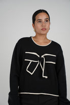 Model wearing a black knit sweater with a large ivory-trimmed bow on the chest and matching hem detailing