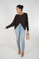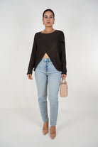 Model is 5’4” – Styled with the Nelly Cardigan Sweater in dark brown, nude pumps, and quilted mini tote.