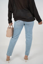 Close-up of model wearing Lila Mom Jeans in light wash with dark sweater and nude heels