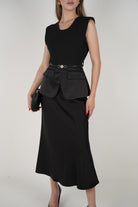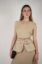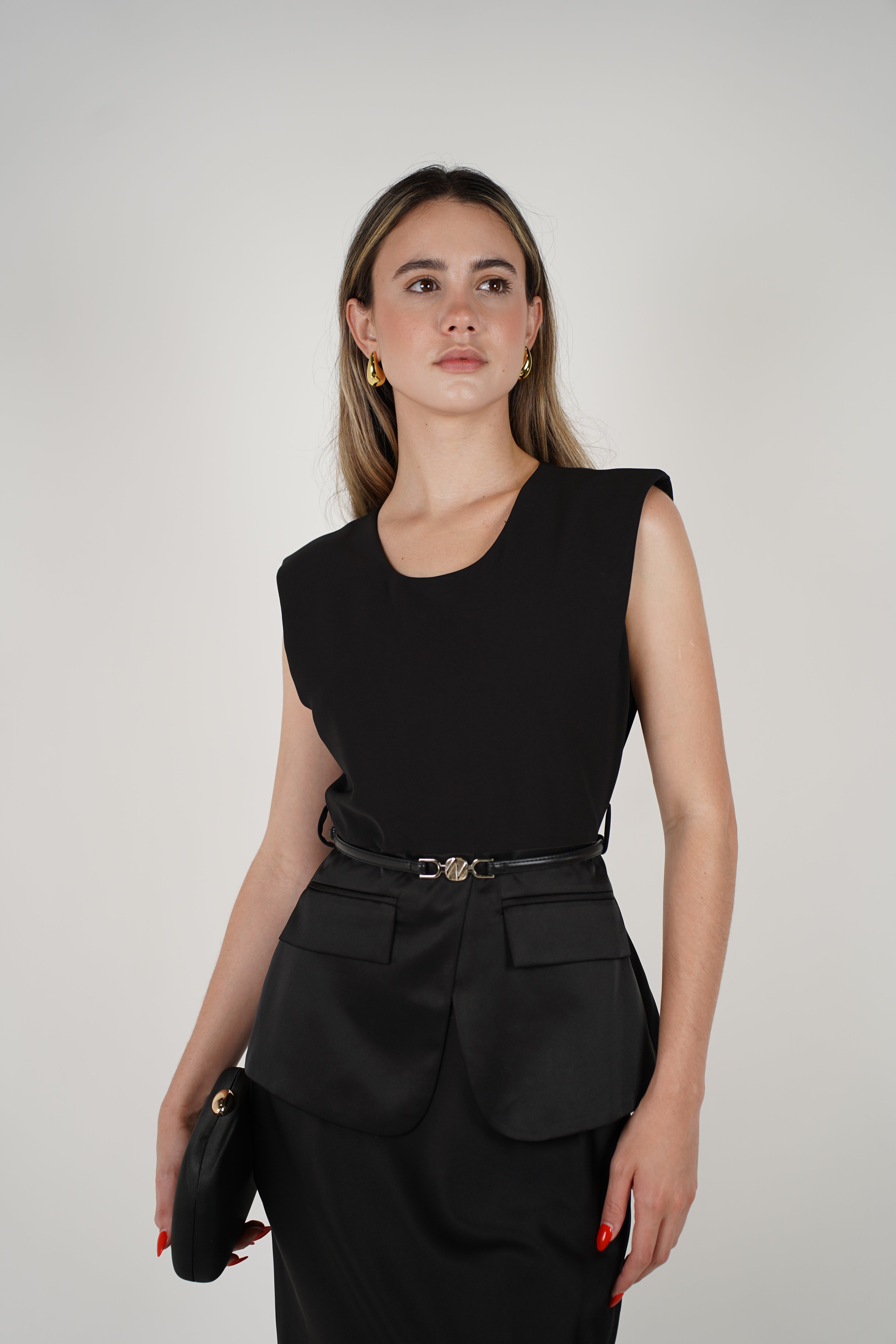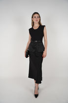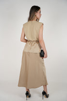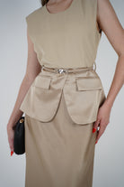 The Luma Belted Maxi Dress is sophistication in motion. Featuring a sleeveless design with clean lines, this dress is elevated with satin pocket flaps and a slim matching belt for a modern, structured look. Available in classic black and elegant beige, it's the perfect piece for office wear, evening dinners, or polished day looks.