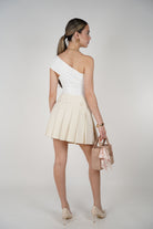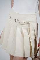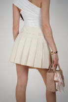 Close-up of cream pleated mini skirt with belt, styled with a long-sleeve black top