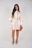 A romantic belted mini dress featuring soft floral detailing, elegant embroidery accents, and a flattering waist-defining silhouette.