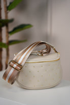 Cream pebbled crossbody bag with gold studs and a striped adjustable strap displayed on a white surface