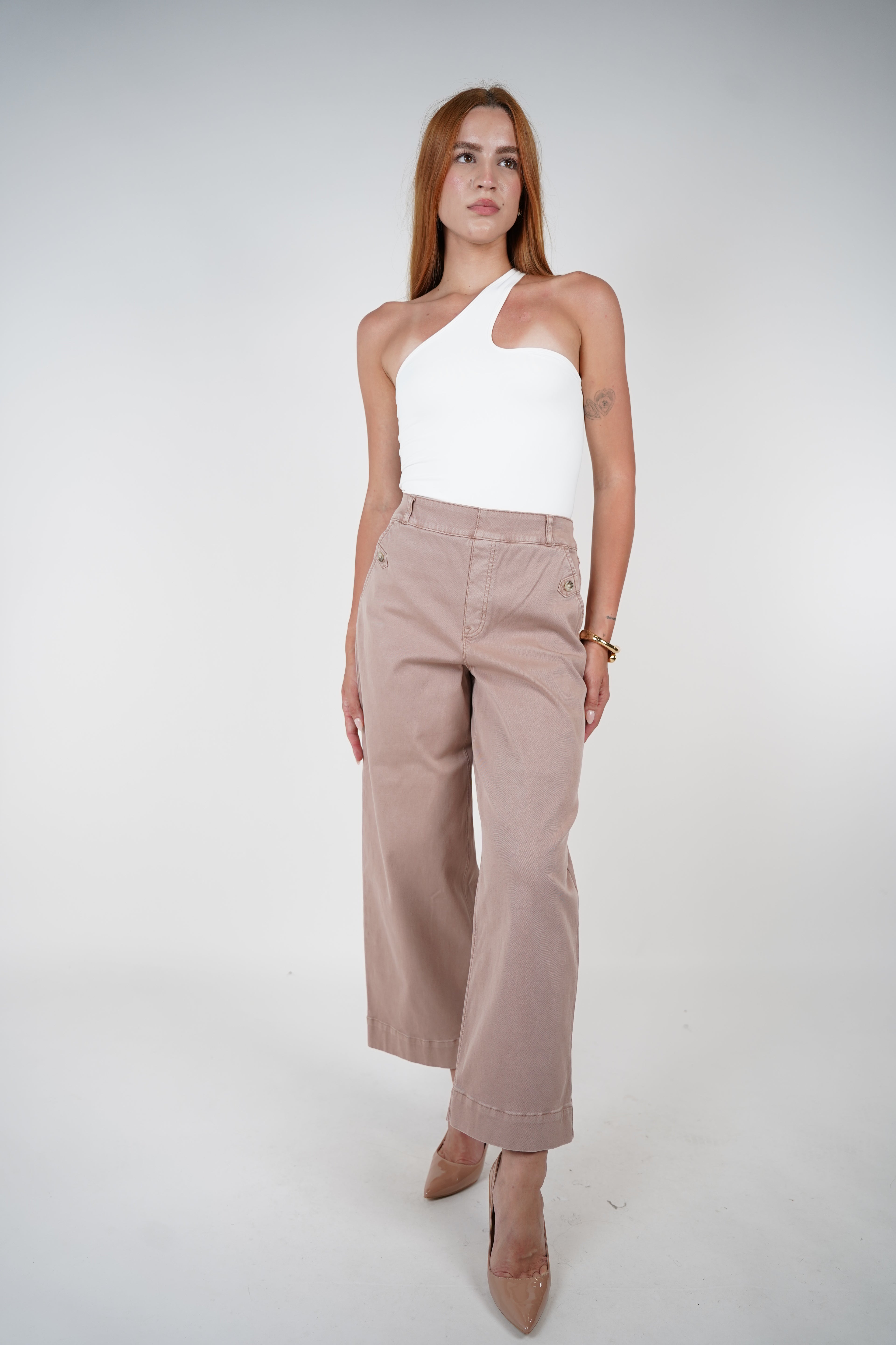 Model wearing high-rise khaki wide-leg pants with side button detail and nude heels.