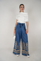 Blue wide-leg embroidered pants with tan tribal print and waist tie, styled with a white sculptural top and heels.