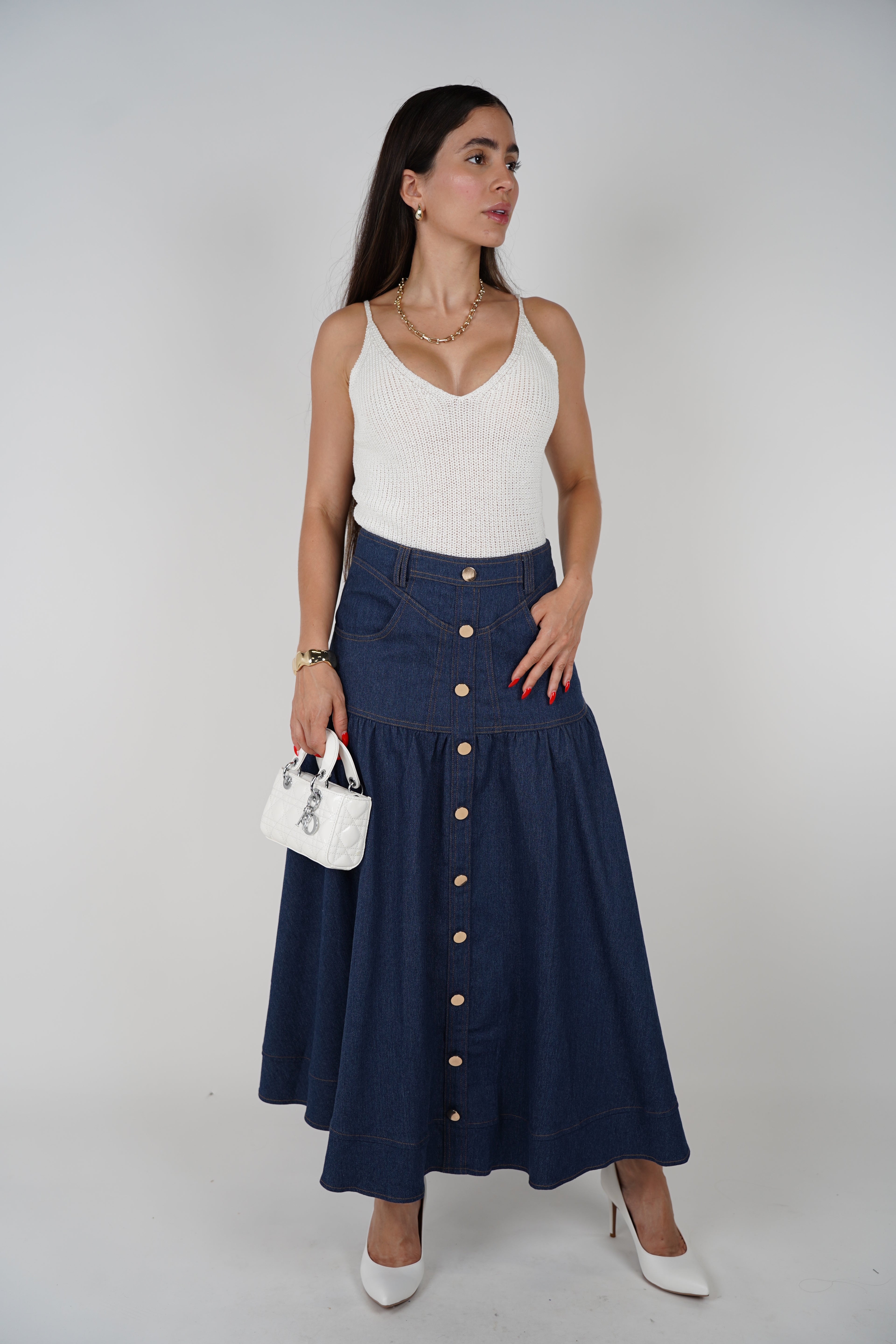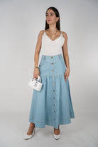 Meta Description: Shop the Oriya Maxi Skirt featuring a high-waist, button-down front, and elegant silhouette. Available in Small, Medium, and Large.