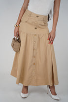 Meta Title: Oriya Maxi Skirt – High-Waisted Button-Down Beige Skirt