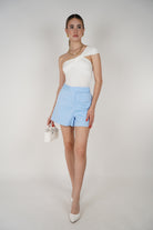 Pastel blue tailored shorts styled with a white one-shoulder top, white heels, and a mini white handbag.