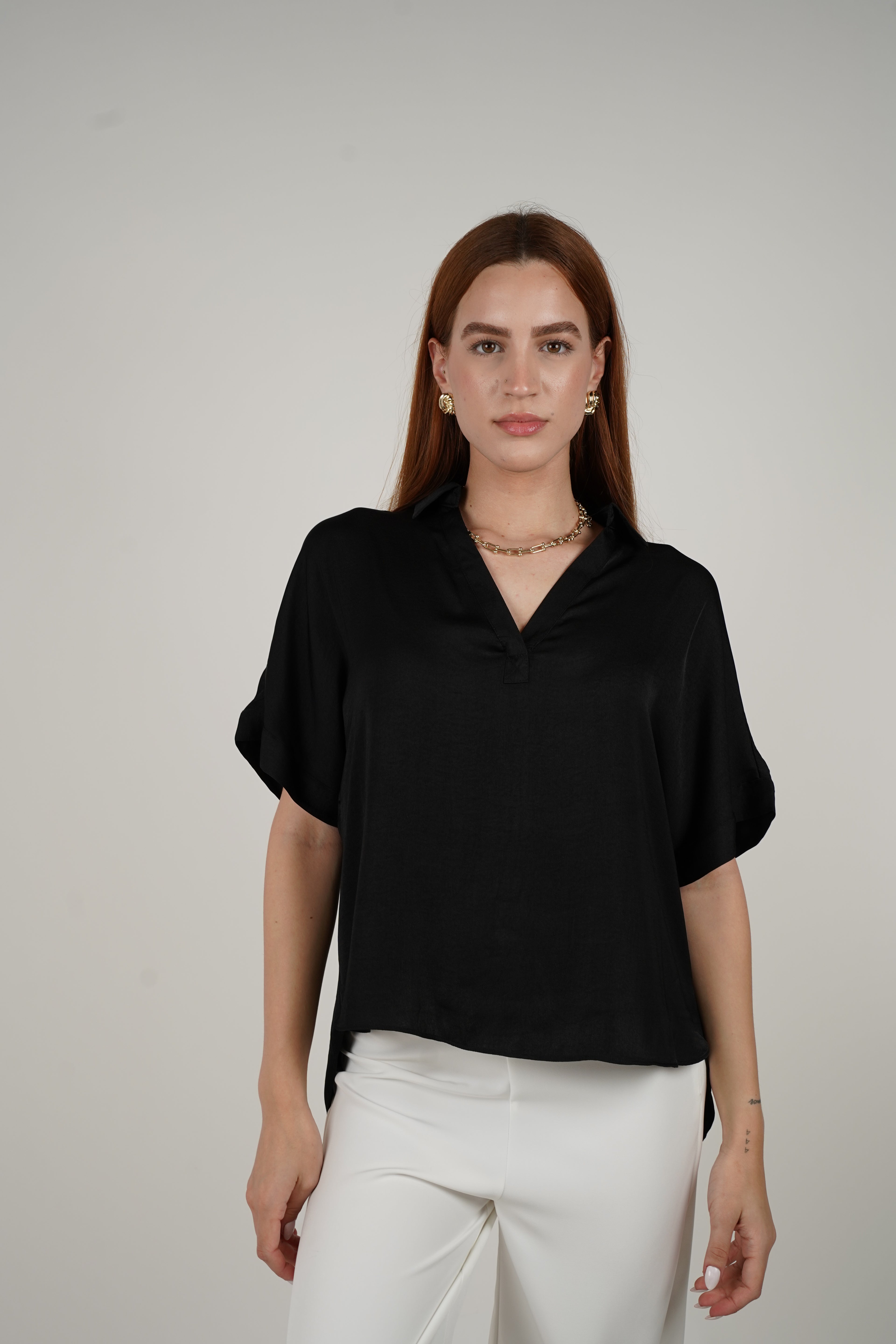 Meta Description: Shop the Rynna Flaca Top featuring a collared neckline, relaxed fit, and V-cut front. Available in black, light pink, and white. Sizes S, M, L.