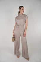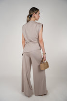 Model wearing the Sira Soft Top in chocolate brown with a draped neckline and sleeveless fit.
